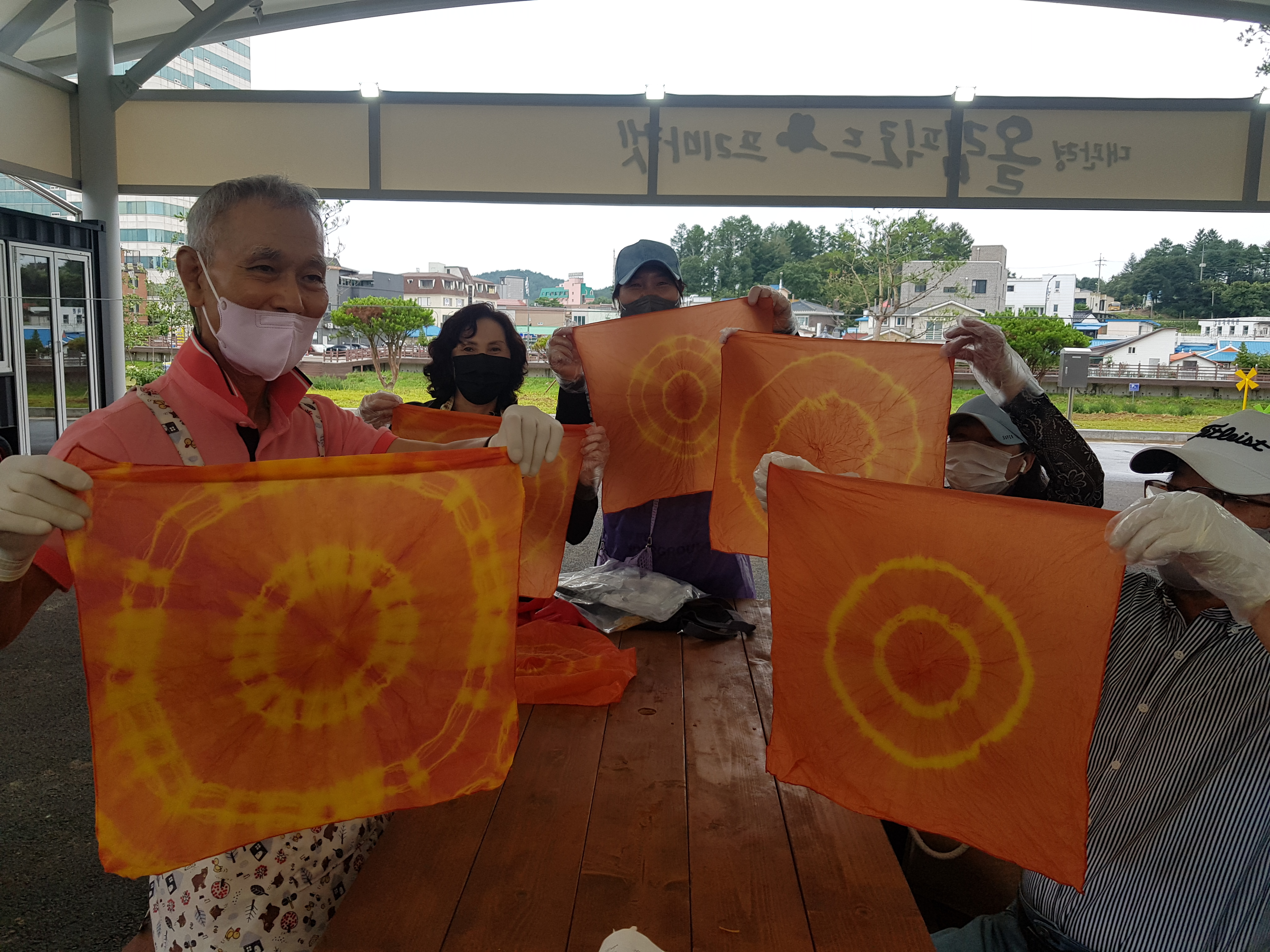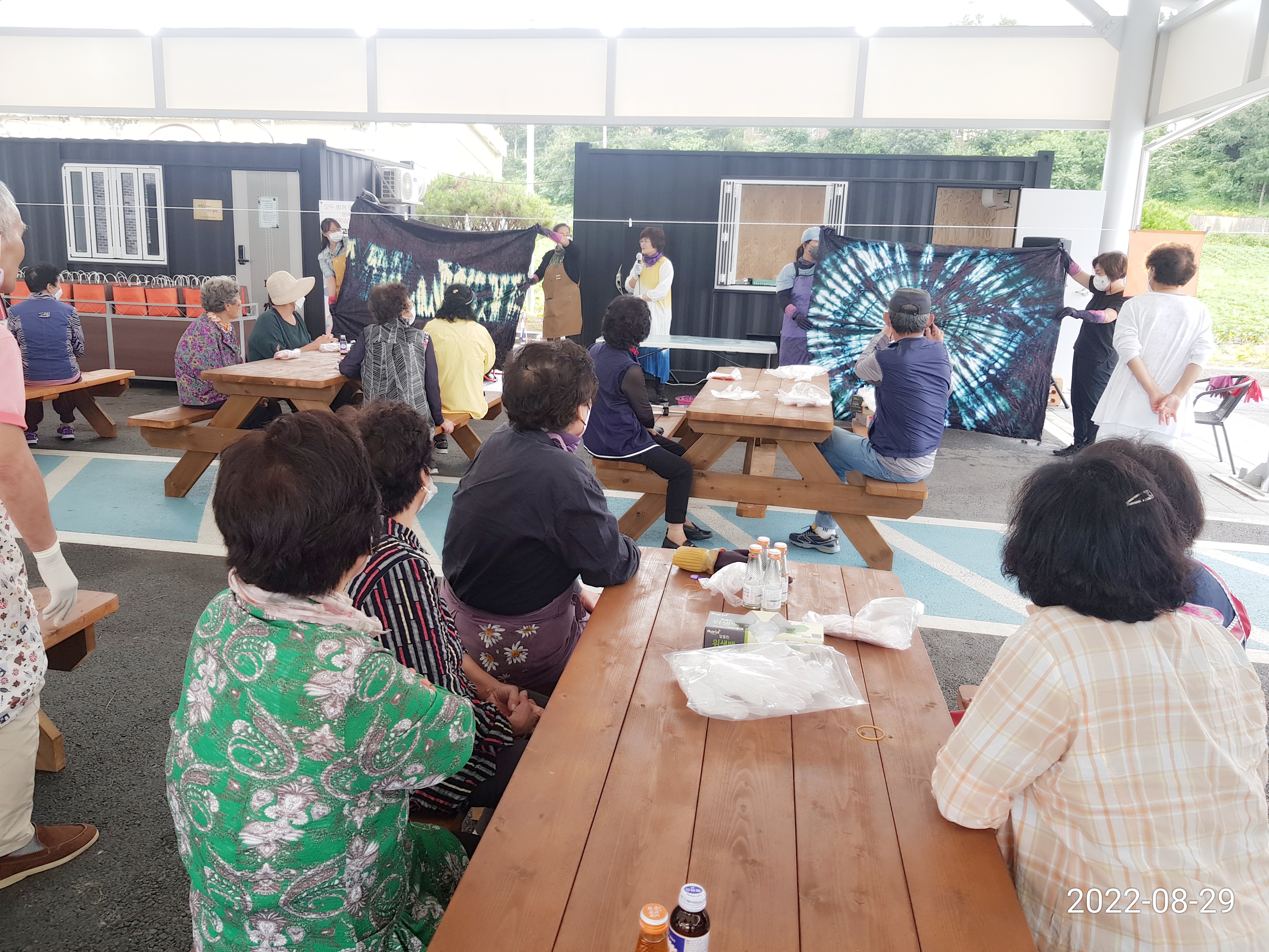 2022년 8월 29일 오전 10시 대관령 해피700센터 외부 체험 장에서 대관령도서관 초등인정교실 학습자들을 비롯하여 대관령 성인문해 학습자들의 ‘손수건 인디고 홀치기염색, 소목 홀치기 천연 염색’ 물 드리기 창의적 체험활동 하였다.