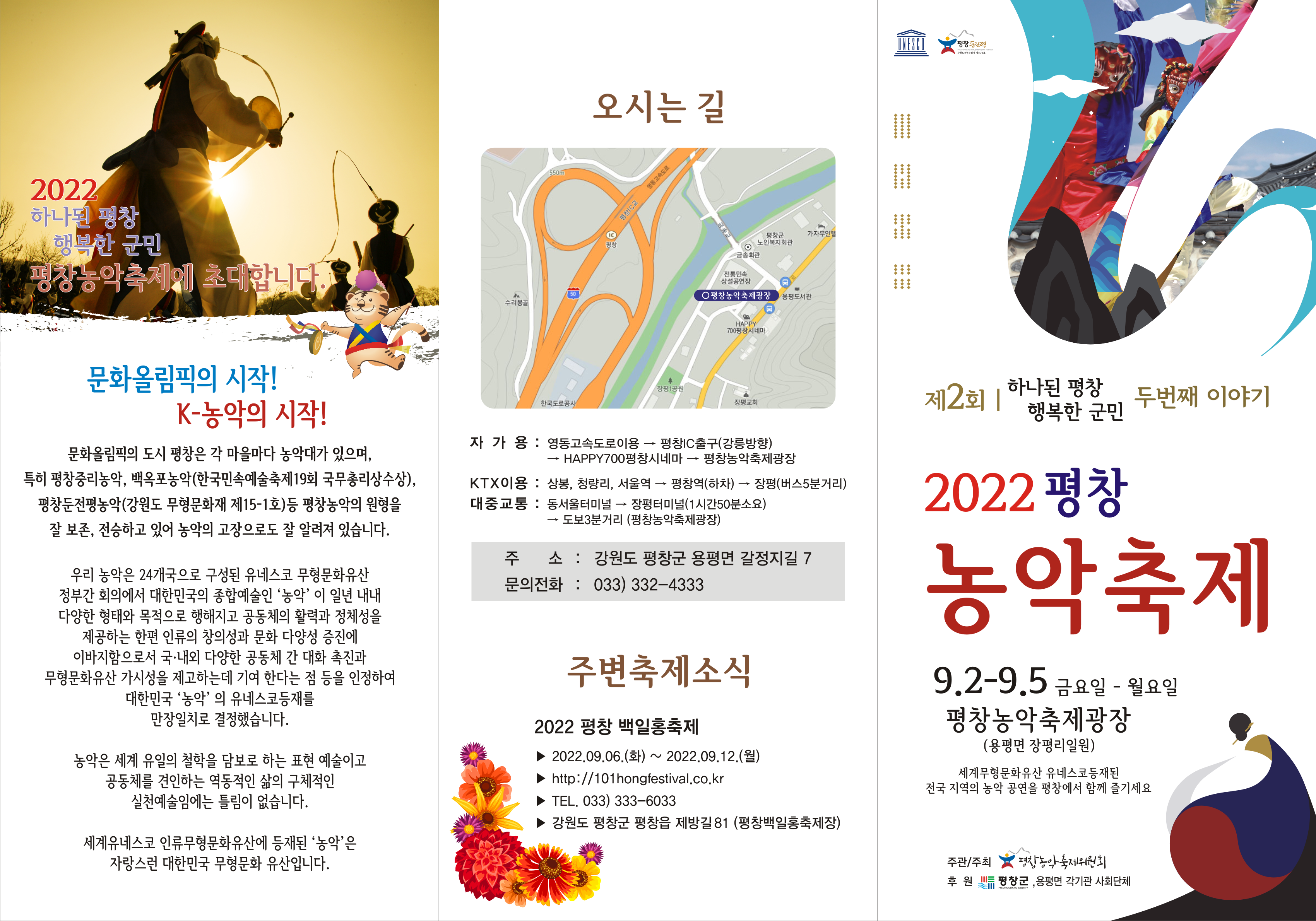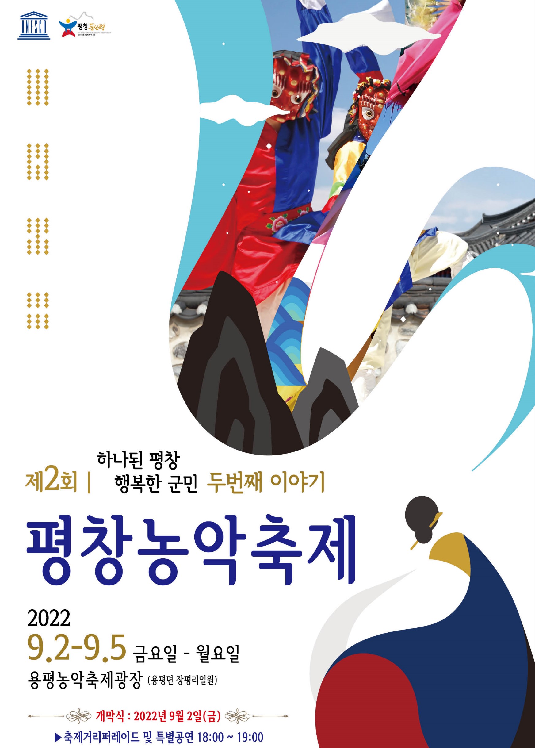 ‘하나된 평창 행복한 군민, 두 번째 이야기’를 주제로 제2회 평창농악축제가 9월 2일부터 5일까지 4일간 평창농악축제광장(전통민속상설공연장)일원에서 평창군농악축제위원회(위원장 김철규) 주관으로 개최된다.
