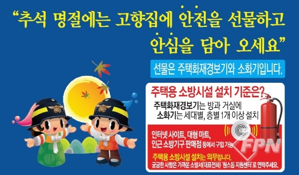 소방서 관계자는 “다가오는 추석 연휴 기간 고향에 계신 가족의 안전을 위해 주택용 소방시설을 선물해드리자”고 전했다.