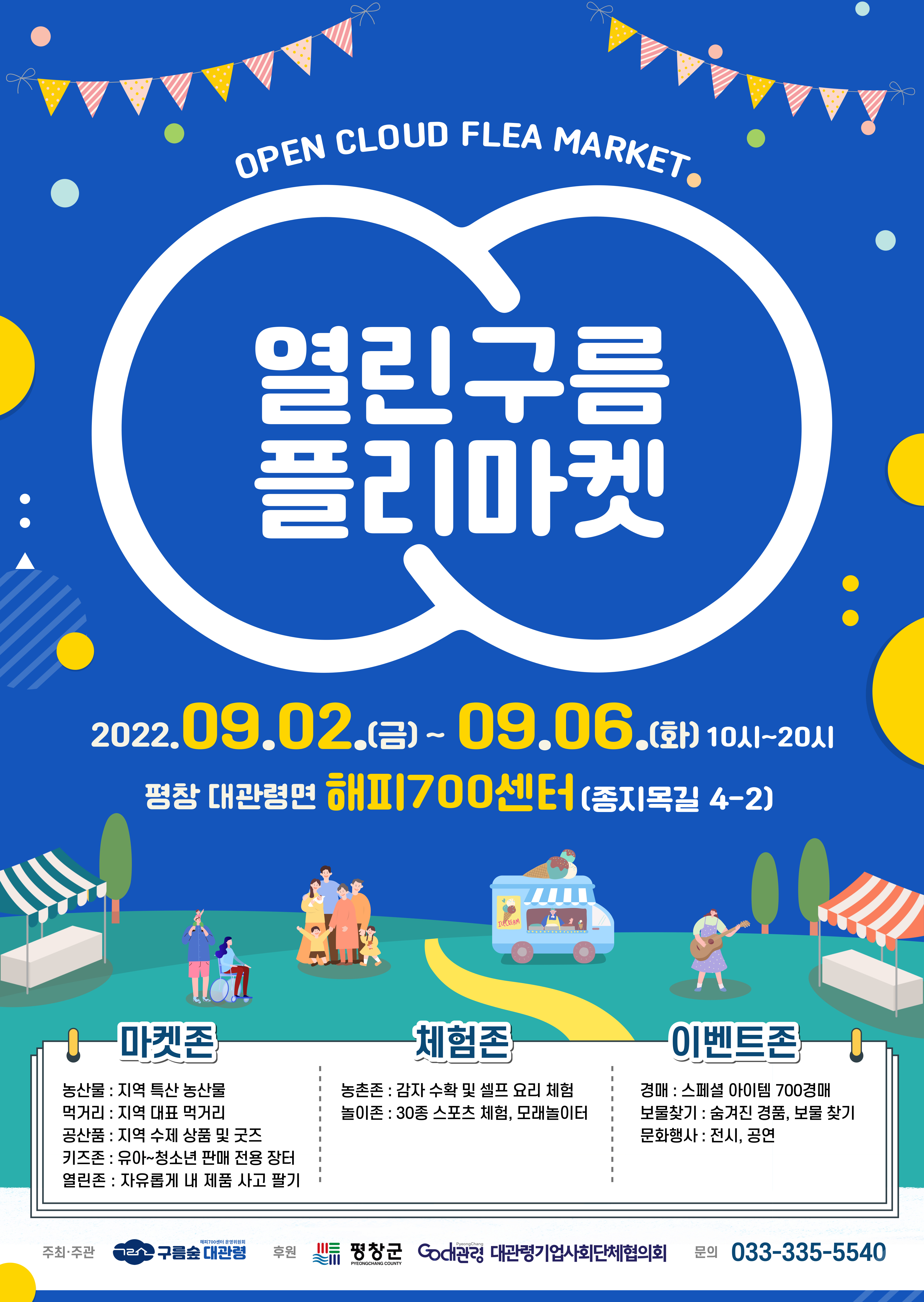 주민주도의 농촌중심지활성화를 위하여 개최하는 이번 ‘열린구름 플라마켓’은 대관령면 농촌중심지활성화사업 운영위원회가 주최·주관하고 대관령면 사회단체와 평창군이 후원한다.