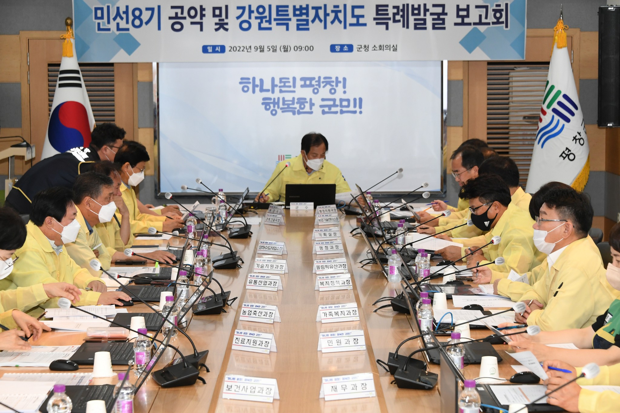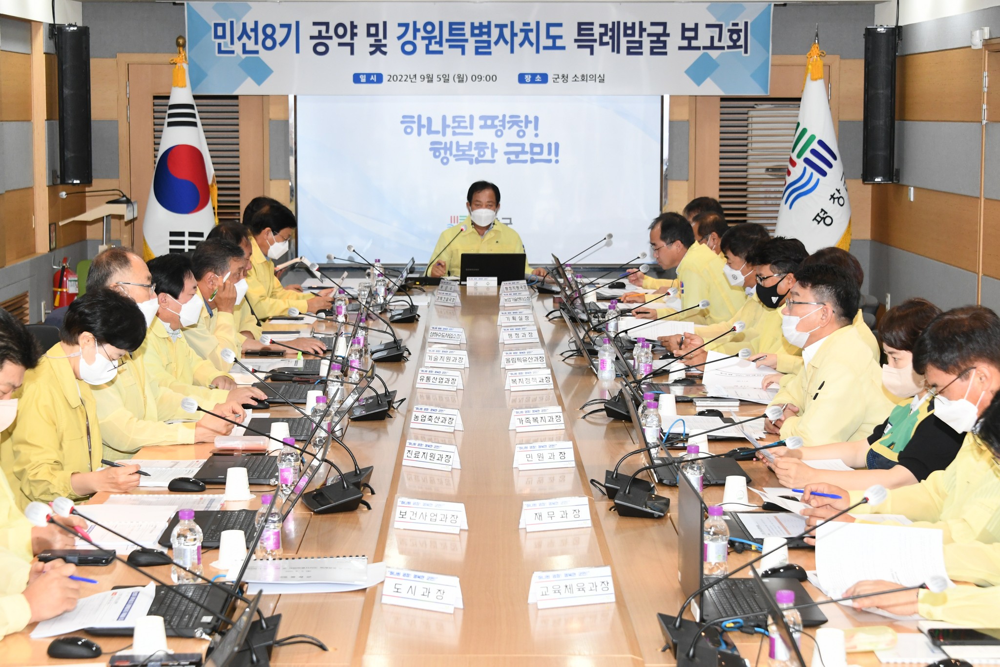 평창군은 오늘 5일 오전, 군청 소회의실에서 심재국 평창군수를 비롯한 부군수, 실·과·소장들이 참석한 가운데 ‘민선8기 공약사업 및 강원특별자치도 특례발굴 보고회’를 개최했다.
