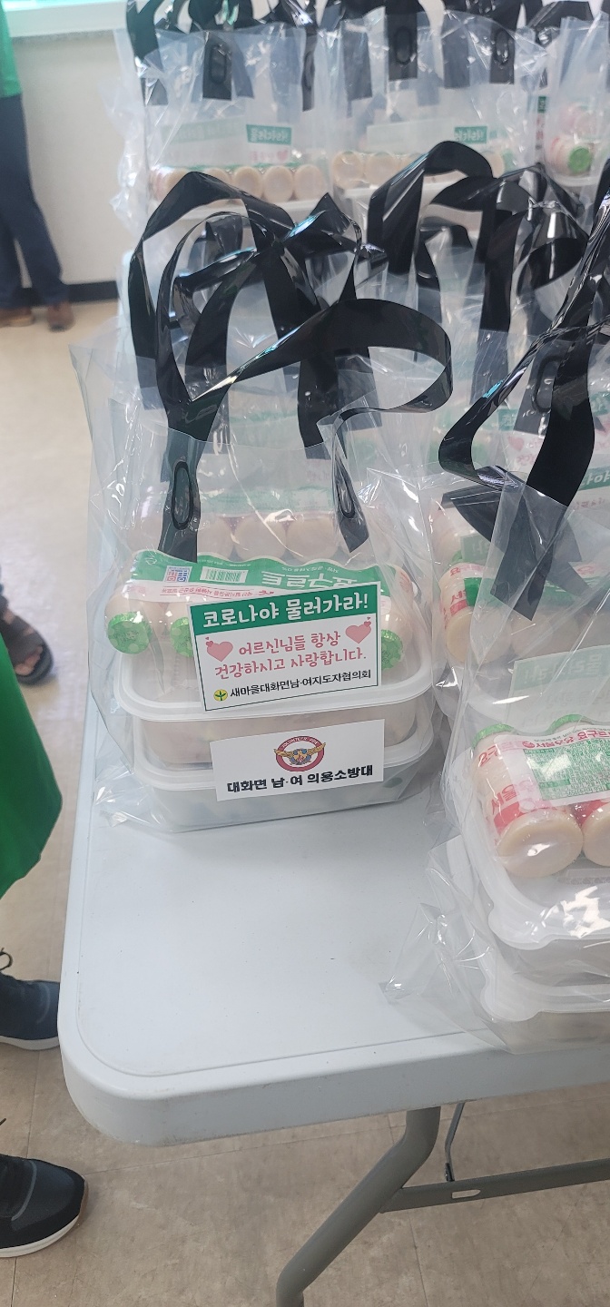평창군 대화면은 8일 추석명절을 맞이해 기초생활보장수급자, 차상위계층 10가구에 김치 5키로와 쌀, 김 세트 등을 전달했다. 대화면 남녀새마을지도자협의회(회장 김명수, 마영희)와 대화면 의용소방대의 이웃을 위한 나눔과 각 가정에 배부되는 물품은 더위사냥축제 사무국장 이명종 및 익명의 기부자가 기부한 물품으로 마련되었으며, 음식을 준비해서 드시지 못하는 고령층이 주 대상자로 선정되었다.