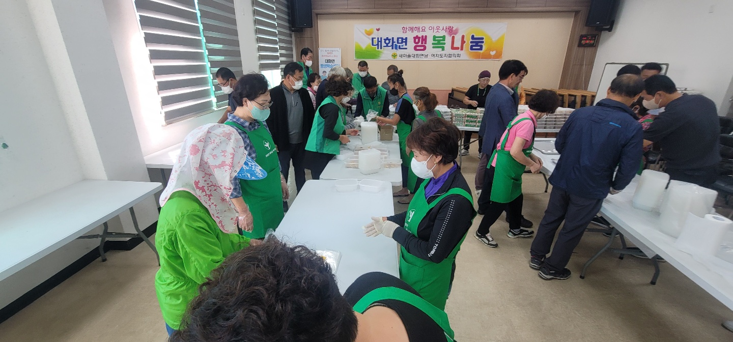 평창군 대화면은 8일 추석명절을 맞이해 기초생활보장수급자, 차상위계층 10가구에 김치 5키로와 쌀, 김 세트 등을 전달했다. 대화면 남녀새마을지도자협의회(회장 김명수, 마영희)와 대화면 의용소방대의 이웃을 위한 나눔과 각 가정에 배부되는 물품은 더위사냥축제 사무국장 이명종 및 익명의 기부자가 기부한 물품으로 마련되었으며, 음식을 준비해서 드시지 못하는 고령층이 주 대상자로 선정되었다.
