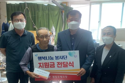 평창우체국은 해마다 명절 및 연말을 맞이하여 지역 내 장애인, 혼자 사는 노인, 복지시설 등을 방문하여 지원물품 및 지원금을 전달하는데, 올해는 관할지역 읍사무소의 추천을 받아 생활이 어려운 2가구를 선정하여 30만원씩 총 60만원의 지원금을 전달하였다.
