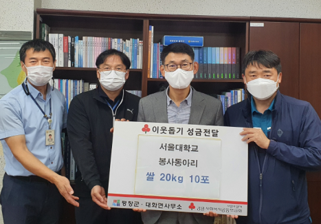지난(9.2.), ‘금당사랑 봉사동아리’(회장 김동수)는 대화면사무소를 방문하여 쌀 20kg 10포를 기부하였다. ‘금당사랑 봉사동아리’는 서울대학교 평창캠퍼스 그린바이오 기술연구원의 소속 직원 25명으로 구성된 봉사동아리로서, 관내 어려운 이웃을 위해 매해 명절 김치·제습기 등 생필품을 기부해오고 있으며, 이번에 기부된 쌀은 추석 명절 전까지 어려운 이웃에게 전달할 예정이다.