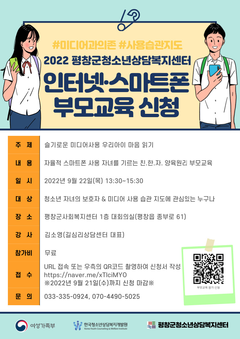 교육 신청 방법은 ‘인터넷·스마트폰 부모교육 신청’ 안내문에 있는 URL 접속 또는 QR코드를 촬영하여 21일까지 신청서를 작성 및 제출하면 된다(문의: 033-335-0924, 070-4490-5025).