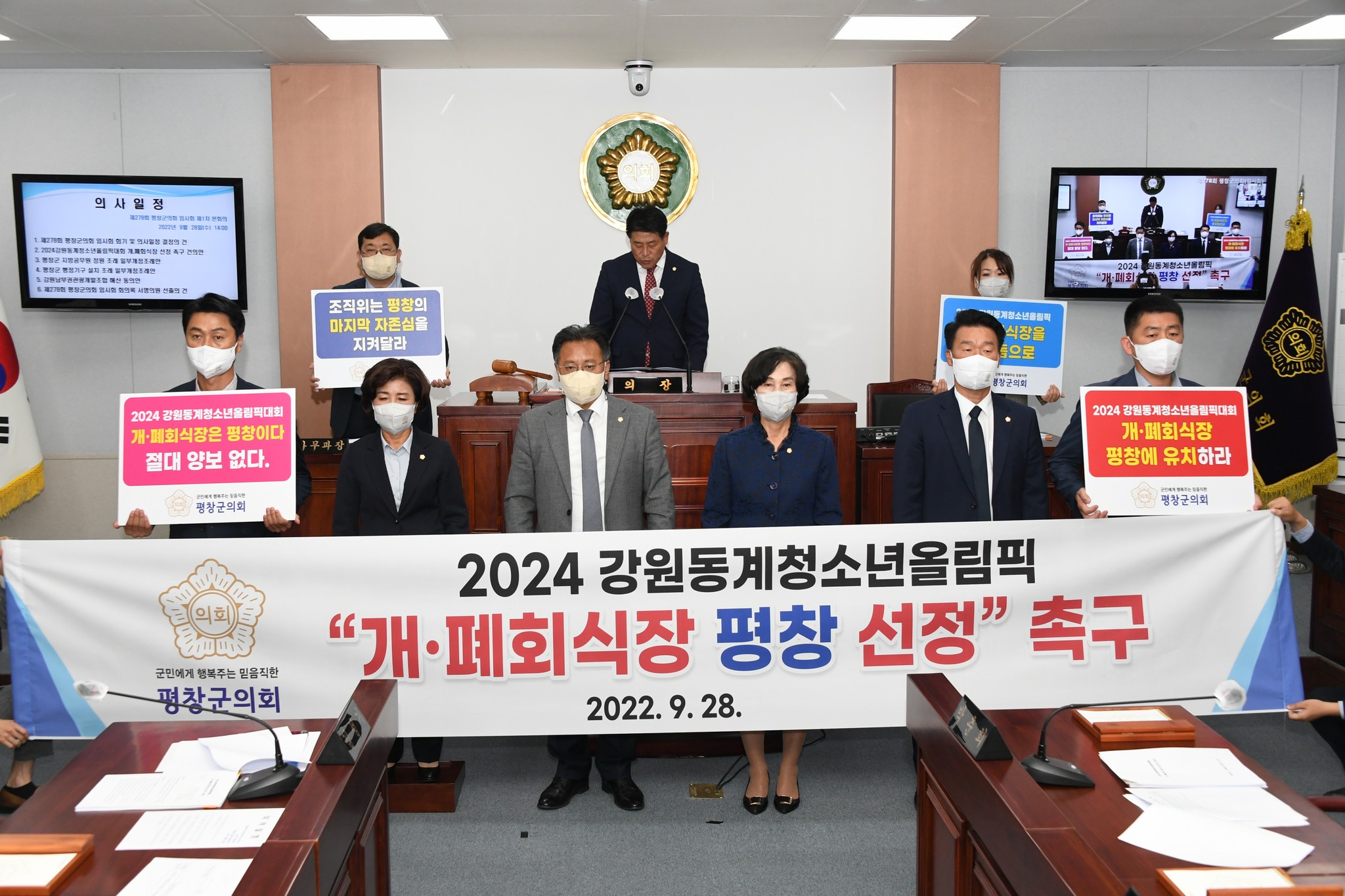 또한,“평창군의회에서는 지난 2019년과 2021년 두 차례에 걸쳐 2024강원동계청소년올림픽대회·폐회식 평창 개최를 강력하게 촉구하였으나 아직도 그 뜻이 반영되지 않아 깊은 유감을 표한다.”고 말했다.