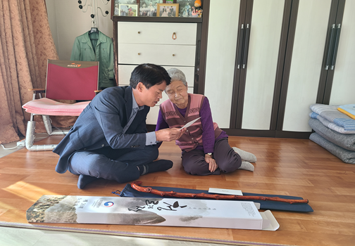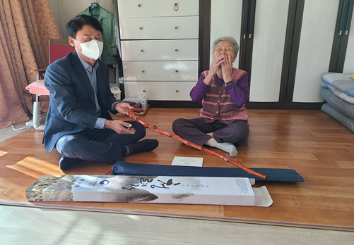 지난(9.30.), 진부면(면장 김복재)은 제26회 노인의 날을 맞아 100세 어르신 댁을 방문하여 장수지팡이(청려장)와 축하카드를 전달하며 감사와 공경의 마음을 전했음.