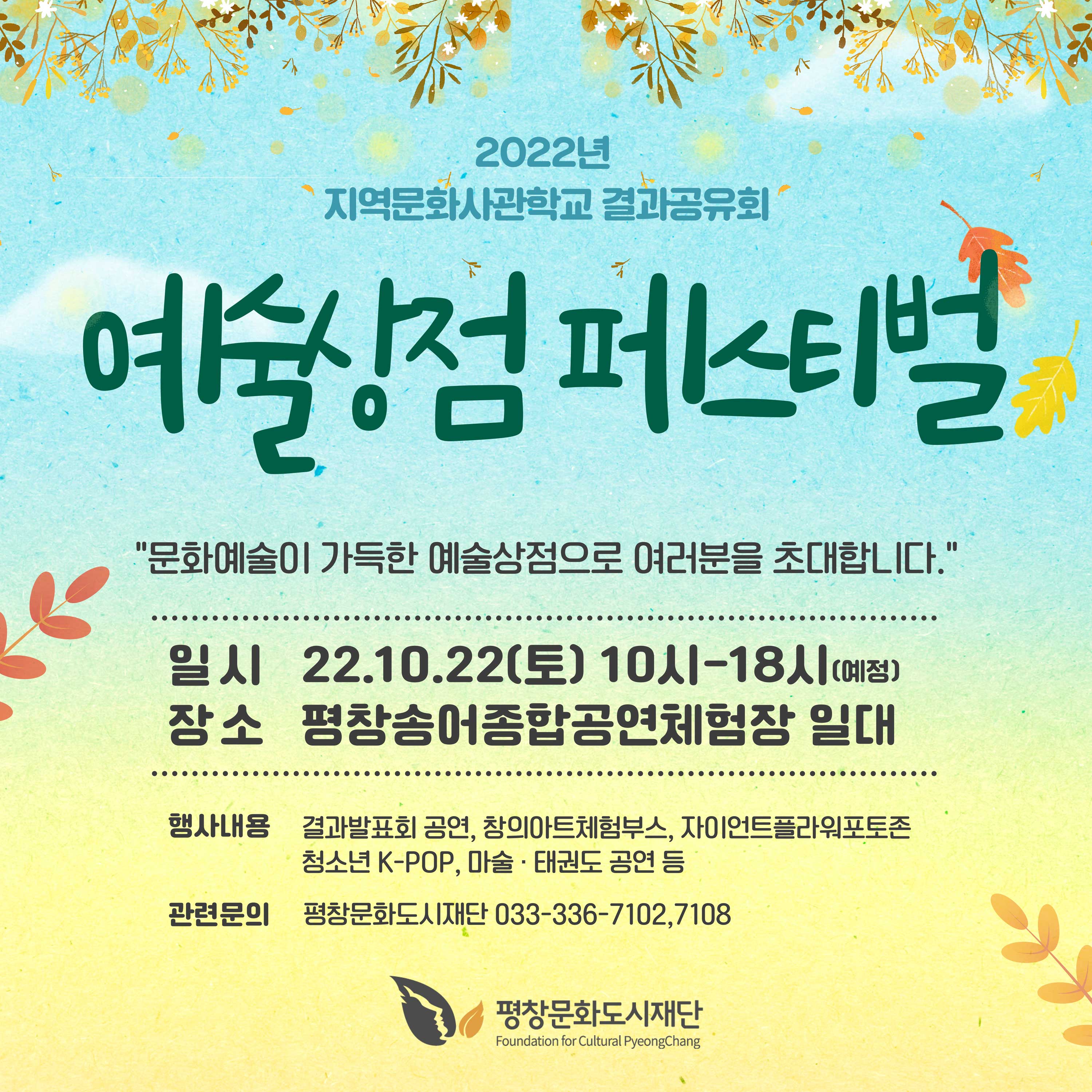 2022년 지역문화사관학교 결과공유회 ‘예술상점 페스티벌’과 관련한 자세한 사항은 평창문화도시재단 공연사업팀 (033-336-7102)으로 문의 가능하다.