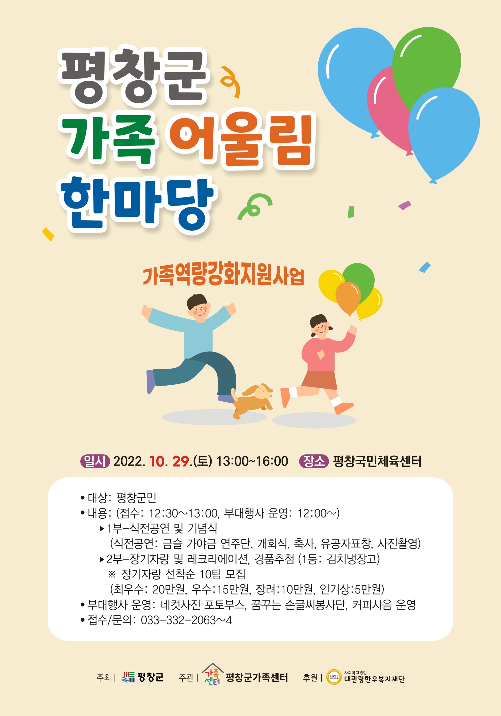 평창군가족센터(센터장 최미자)에서는 오는 10월 29일 가족역량강화지원사업의 일환으로 “평창군 가족 어울림한마당”을 실시한다.