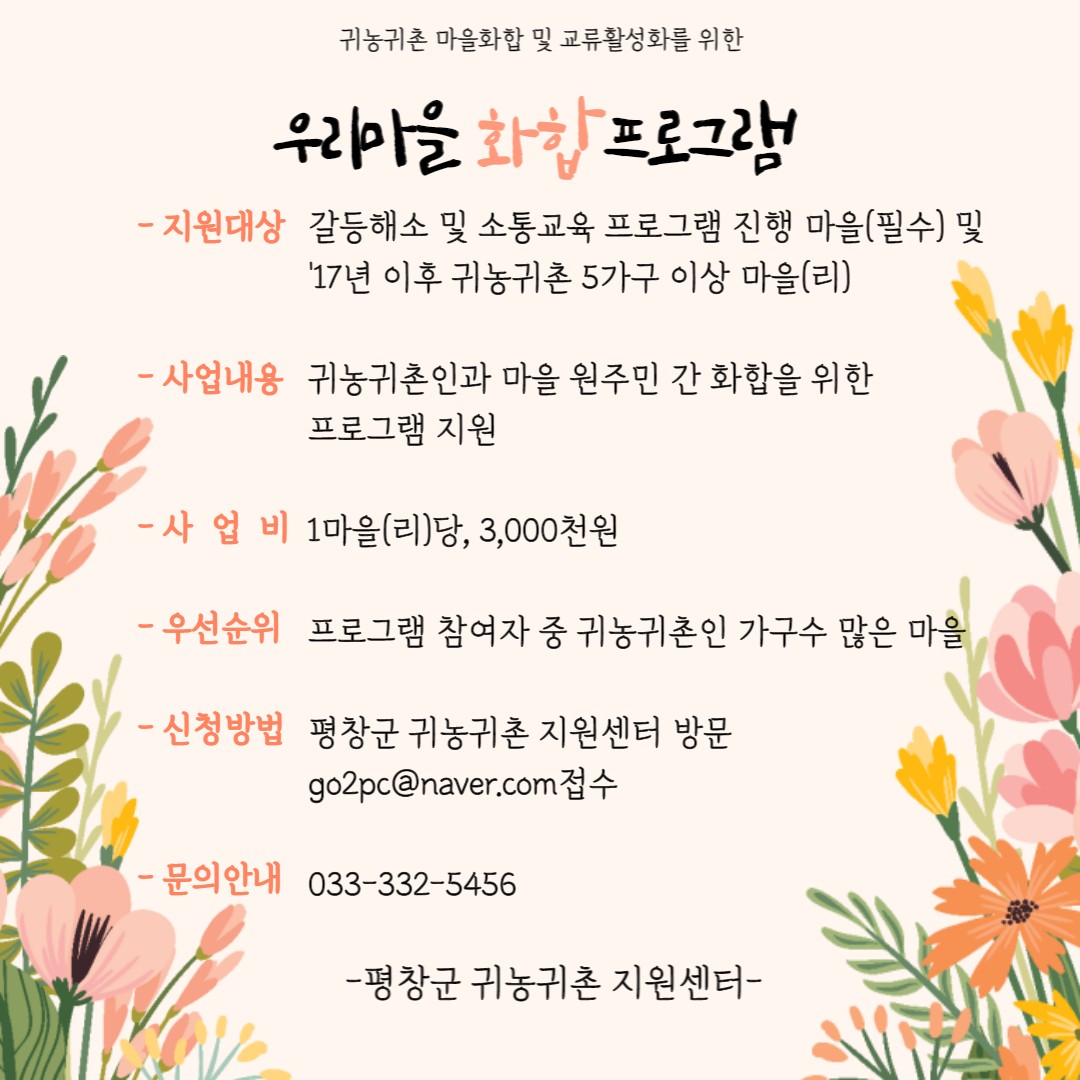 오늘(10.26.)부터 내일(10.27.)까지, 평창군 농정과(농촌협약)와 한국농어촌공사는 남부권 3개면을 순회하며 각 면 기관·사회단체장 및 마을주민을 대상으로 농촌생활권(남부) 기본계획 수립 용역 주민설명회를 개최할 예정이다. 이번 주민설명회에서는 농촌생활권(남부) 기본계획 수립과정 및 구상안을 공유하고, 주민위원회 공개모집 안내와 주민 의견 청취 등을 진행할 예정이다.