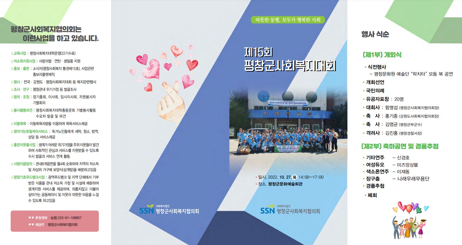 오늘(10.27.) 14:00, 평창군사회복지협의회(회장 함명섭)은 관내 기관·사회단체장 및 사회복지 종사자 등 300여 명이 참석한 가운데 ‘제15회 평창군사회복지대회’를 개최할 예정이다. 이번 행사는 사회복지분야에 대한 군민의 관심을 유도하고, 사회복지 종사들의 노고를 격려하기 위한 것으로, 군민의 복지 증진을 위해 노력한 23명의 사회복지 유공자에 대한 표창 전수와 문화예술인들의 공연을 진행할 예정이다.