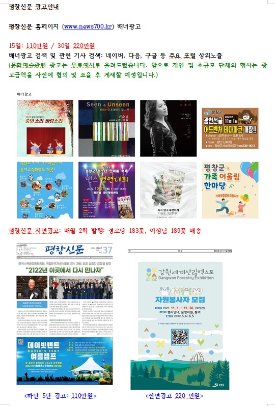 평창군은 사단법인 평창군관광협의회가 추최하는 2022년 평창군 관광 발전 세미나「평창을 만나다.」를 25일 모나파크 용평리조트(드래곤밸리호텔1층, 그랜드볼룸)에서 개최했다.