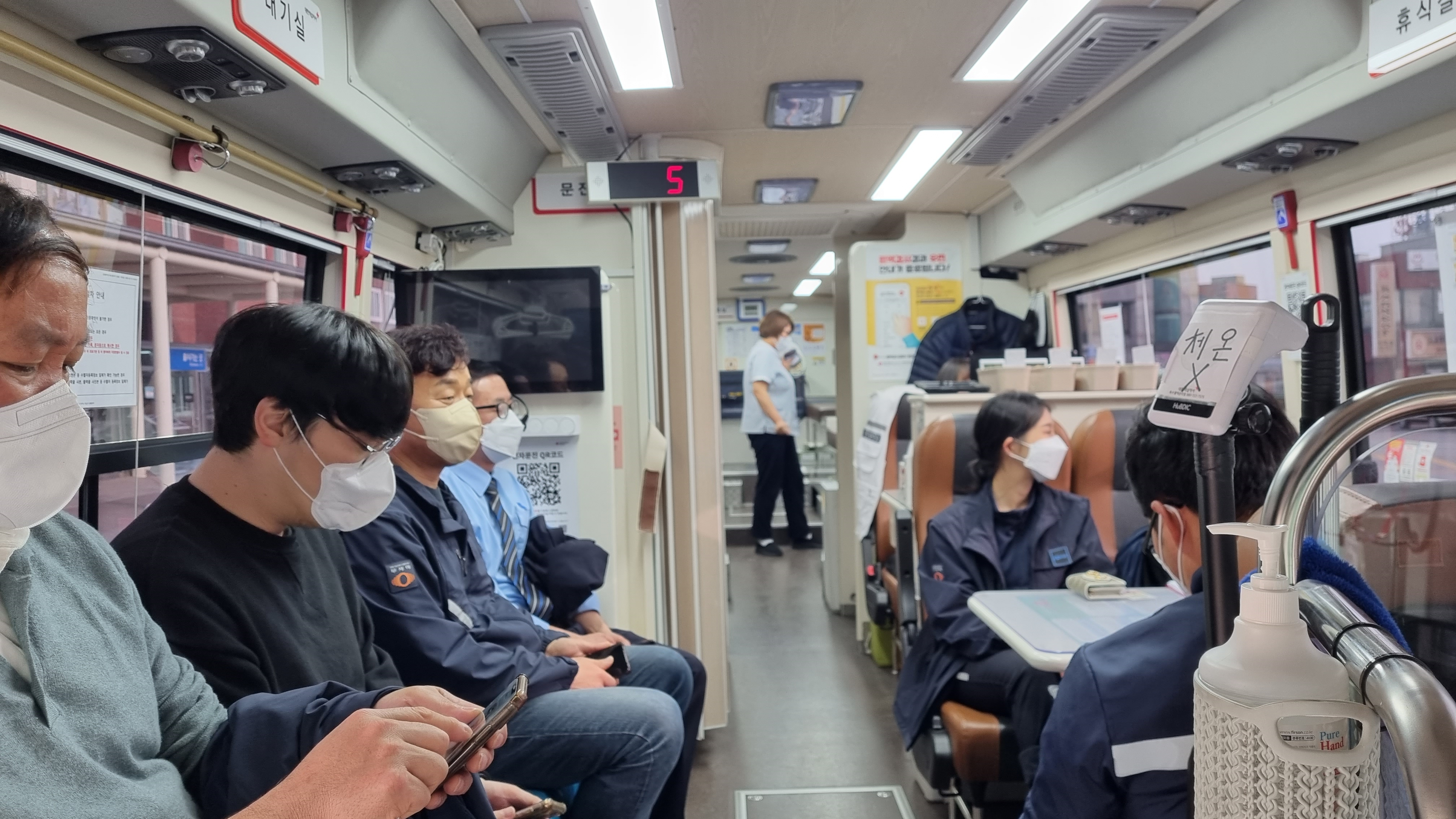 한국철도 직원들이 이동헌혈차량에서 헌혈순서를 기다리고 있다.