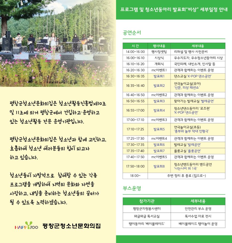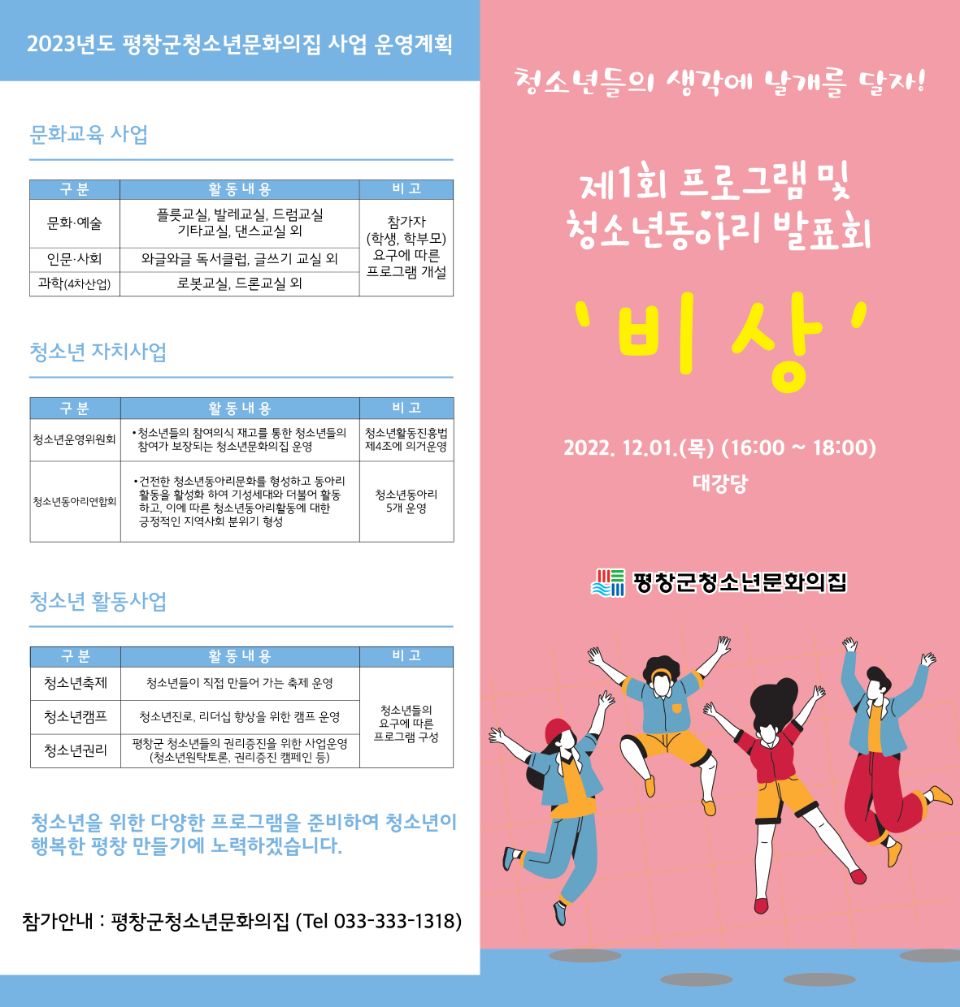평창군청소년문화의집에서는 프로그램 및 청소년동아리활동에 참여한 청소년들에게 긍정적 동기를 부여하고, 대내·외적으로 청소년활동의 긍정적 효과성을 널리 알리고자 프로그램 및 청소년동아리 발표회를 진행하고자 합니다.