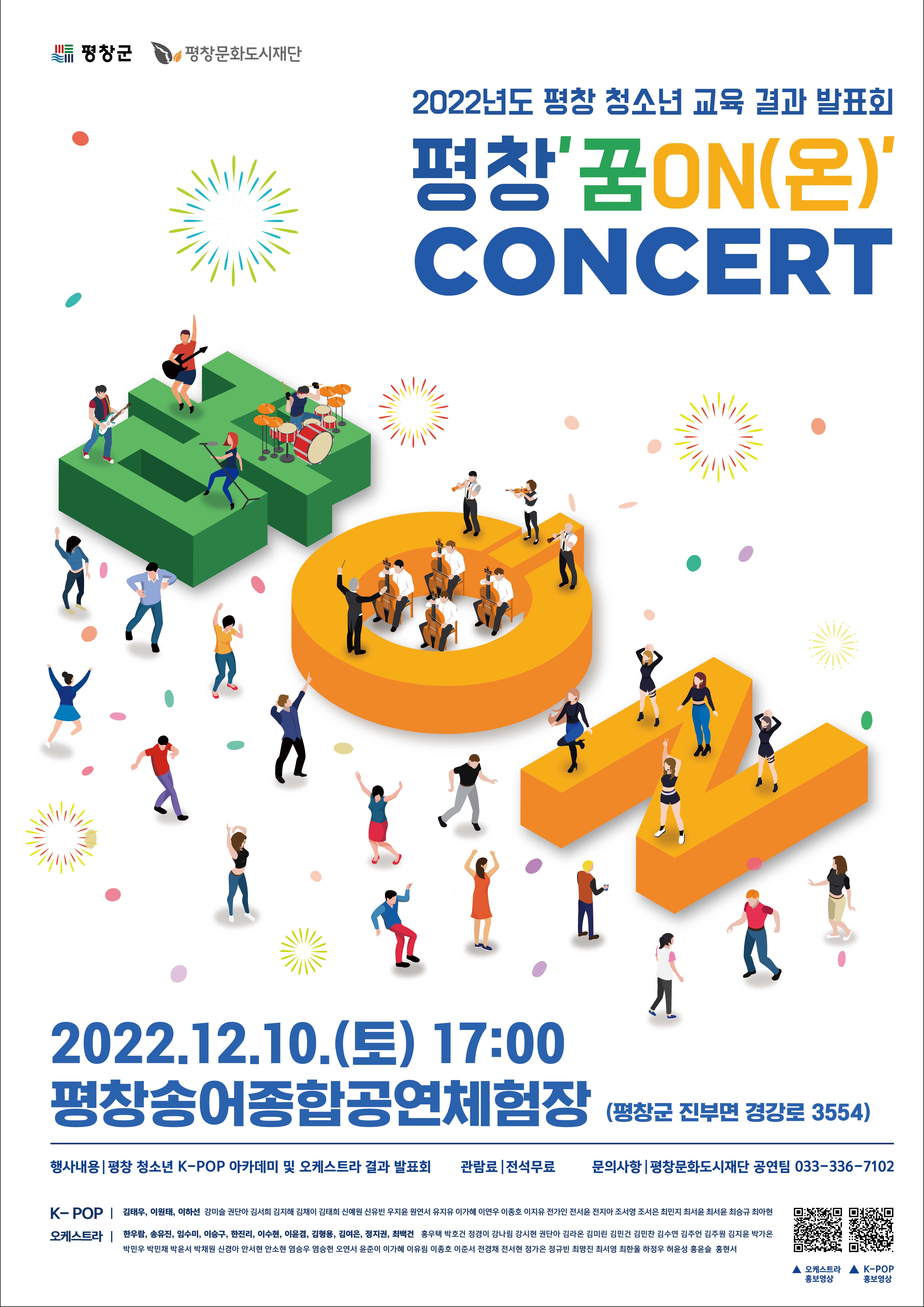 지난 4월부터 12월까지 약 9개월 동안 진행된 ‘청소년 K-POP 아카데미’와 ‘청소년 오케스트라’는, 평창문화도시재단의 자체 교육사업으로 문화예술 활동을 통해 관내 청소년들에게 문화예술 활동의 기회를 제공하고, 사회성을 증진하며 청소년의 잠재적 소질 개발과 인재양성을 지원하는 교육 프로그램으로, 이번 콘서트는 해당 교육의 종합 결과 발표회이자 단원들의 열정과 끼를 발산할 수 있는 무대로 꾸며졌다.