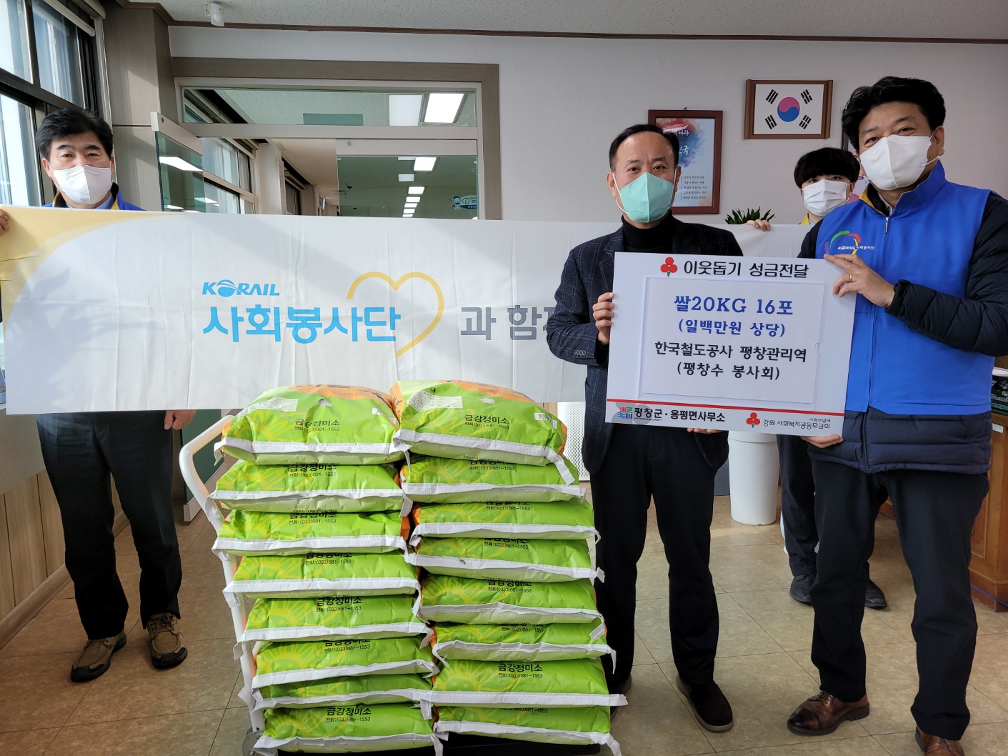 13일 한국철도공사 강원본부 평창 관리역(역장( 주광성) 직원들이) 내방하여 연말연시를 맞아 평창 관리역(평화수( 봉사회)에서 십시일반 모은 성금으로 물품을 구입하여 용평면 내 취약계층에 지원해 달라며 쌀 20kg 16포(100만 원 상당)를 기탁했다.