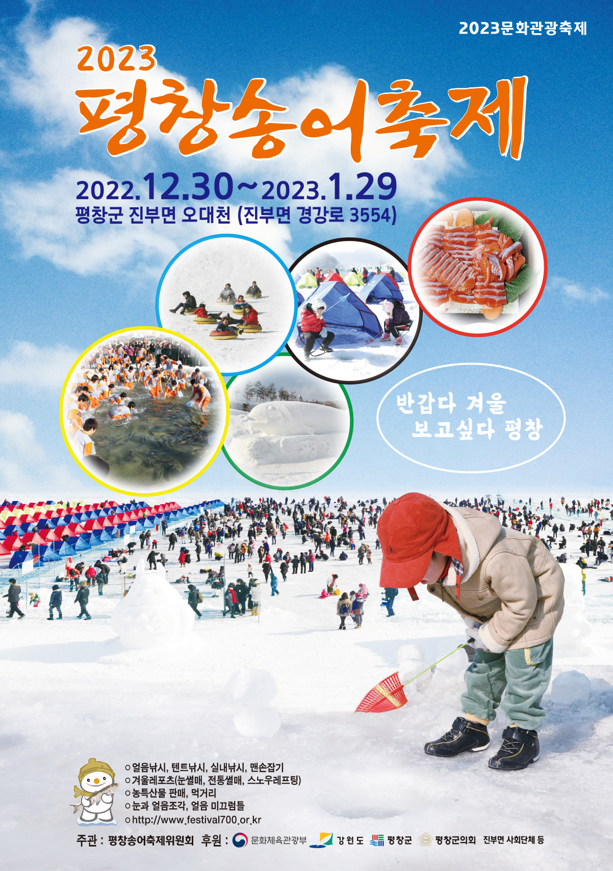 평창송어축제 - 어른과 아이가 함께 동심으로 돌아갈 수 있는 다채로운 프로그램 한가득 - 송어낚시, 눈썰매, 사냥놀이 등 - 감성을 깨워주는 아름다운 눈조각의 향연 - 송어회, 오삼불고기, 황태