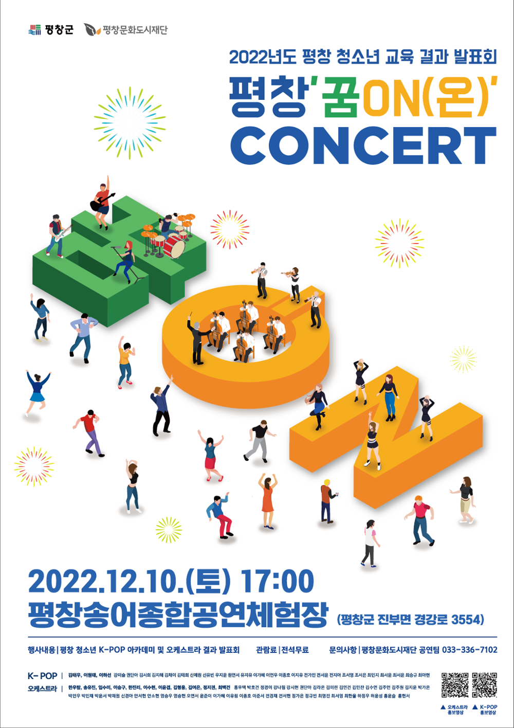 4월부터 12월까지 약 9개월 동안 진행된 ‘청소년 K-POP 아카데미’와 ‘청소년 오케스트라’는, 평창문화도시재단의 자체 교육사업으로 문화예술 활동을 통해 관내 청소년들에게 문화예술 활동의 기회를 제공하고, 사회성을 증진하며 청소년의 잠재적 소질 개발과 인재양성을 지원하는 교육 프로그램이다.