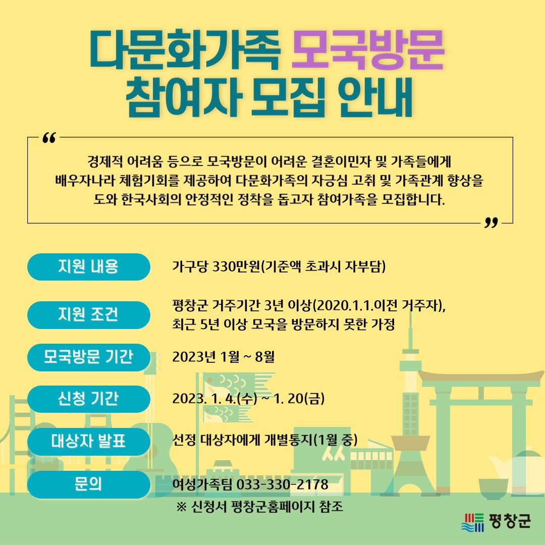 평창군은 1월 4일부터 20일까지 다문화 모국방문 참여자를 모집한다고 밝혔다. 다문화가족 모국방문 지원사업은 경제적 어려움 등의 이유로 모국방문이 어려운 가족들에게 배우자 나라를 체험하는 기회를 제공해 행복한 가정을 형성하고, 한국사회의 안정적인 정착을 위해 추진하는 사업이다. 다문화 모국방문 참여자는 평창군의 선발 방침에 따라 선발한다. 군은 3년 이상 평창군 거주자 및 5년 이상 모국을 방문하지 못한 결혼이민자로, 국적 취득 여부, 자녀 수, 경제 상황, 거주기간 등을 종합 평가해 4세대를 선정한다. 선발된 가정에는 왕복 항공료와 여행자 보험료, 교통비 등 1세대당 최대 300만원을 지원한다. 선정된 세대는 올해 8월까지 모국을 방문해야 한다. 심재국 군수는 "모국 방문 지원사업을 통해 가족 간 문화적 이해를 도울 수 있는 계기가 되기를 바라며, 앞으로 다양한 다문화가족 지원사업을 펼쳐 안정적인 지역사회 정착을 돕겠다"고 밝혔다.