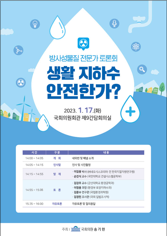 1월 17일(화) 오후 2시 국회의원회관 제9간담회의실에서 지하수 방사성물질 전문가 토론회 개최