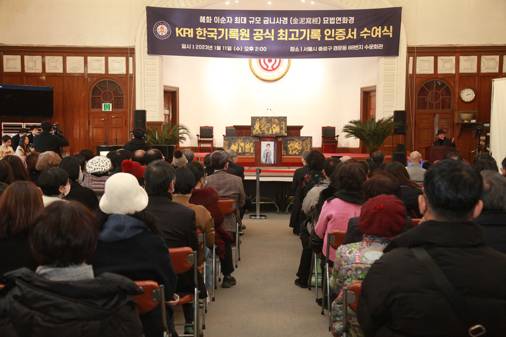 한국기록원은 우리나라의 우수한 기록을 KRI 한국기록원 공식 최고 기록으로 인증하고 미국 World Record Committee (WRC/세계기록위원회) 등 해외 기록 인증 업체에 도전자를 대신해 인증 심의를 요청하는 최고기록 인증 전문 기관으로 혜화 이순자 작가의 "금니사경(金泥寫經) 묘법연화경”이 전 세계로 알려지는 계기가 되기를 바라고 있다. 또한 인증식에서 종교적으로 매우 가치 있는 "금니사경(金泥寫經) 묘법연화경"을 불교신자는 물론 일반인들에게 공개하고 전시하여 감동을 선사하는 기회도 제공하고 있다.