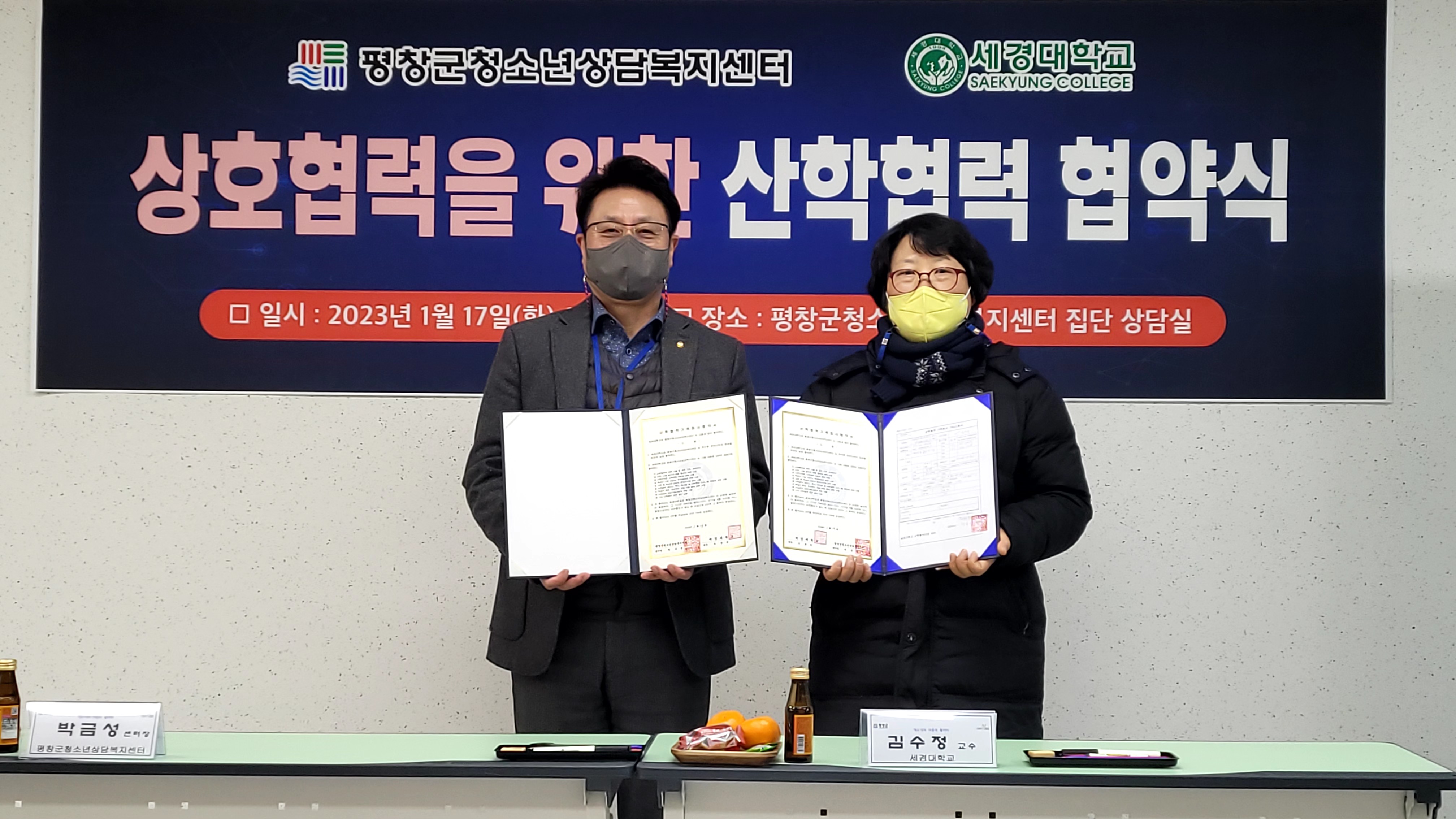 이날 협약식은 세경대학교 사회복지학교 김수정 교수와 평창군청소년상담복지 박금성 센터장 및 실무진들이 참여한 가운데 △경영 자문 및 공동연구 △산학연계형 교육과정 개발 △산학협력 세미나, 특강, 워크숍 등 산학협력 프로그램 운영 등 산학협력 관련 제반 사항에 대하여 업무협약을 체결했다.