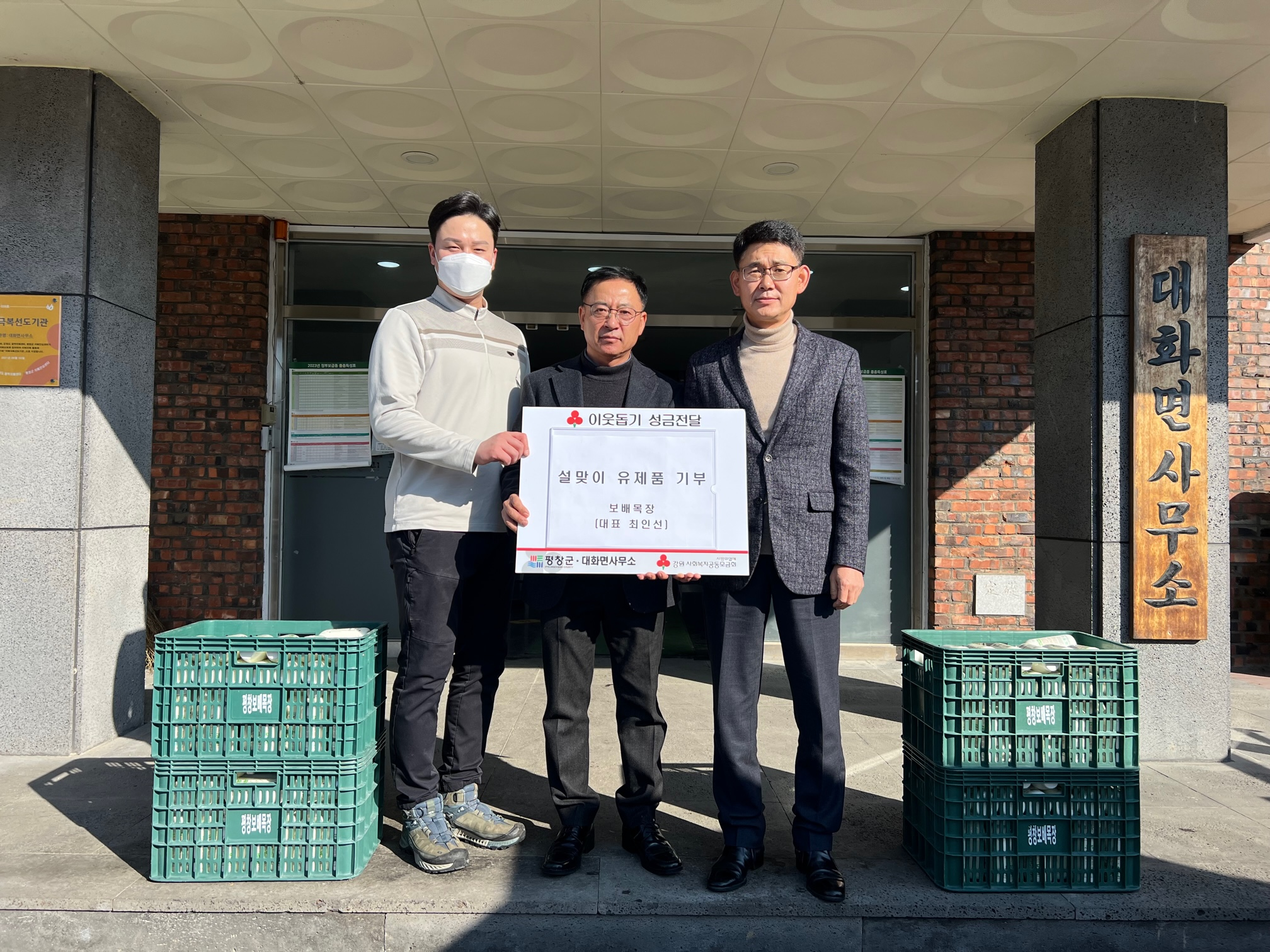 대화면 소재 보배목장의 최인선 대표는 다가오는 설 명절을 맞이하여 관내 소외된 이웃을 위해 약 600만원 상당의 유제품(요거트 등)을 대화면사무소에 기부하였다.