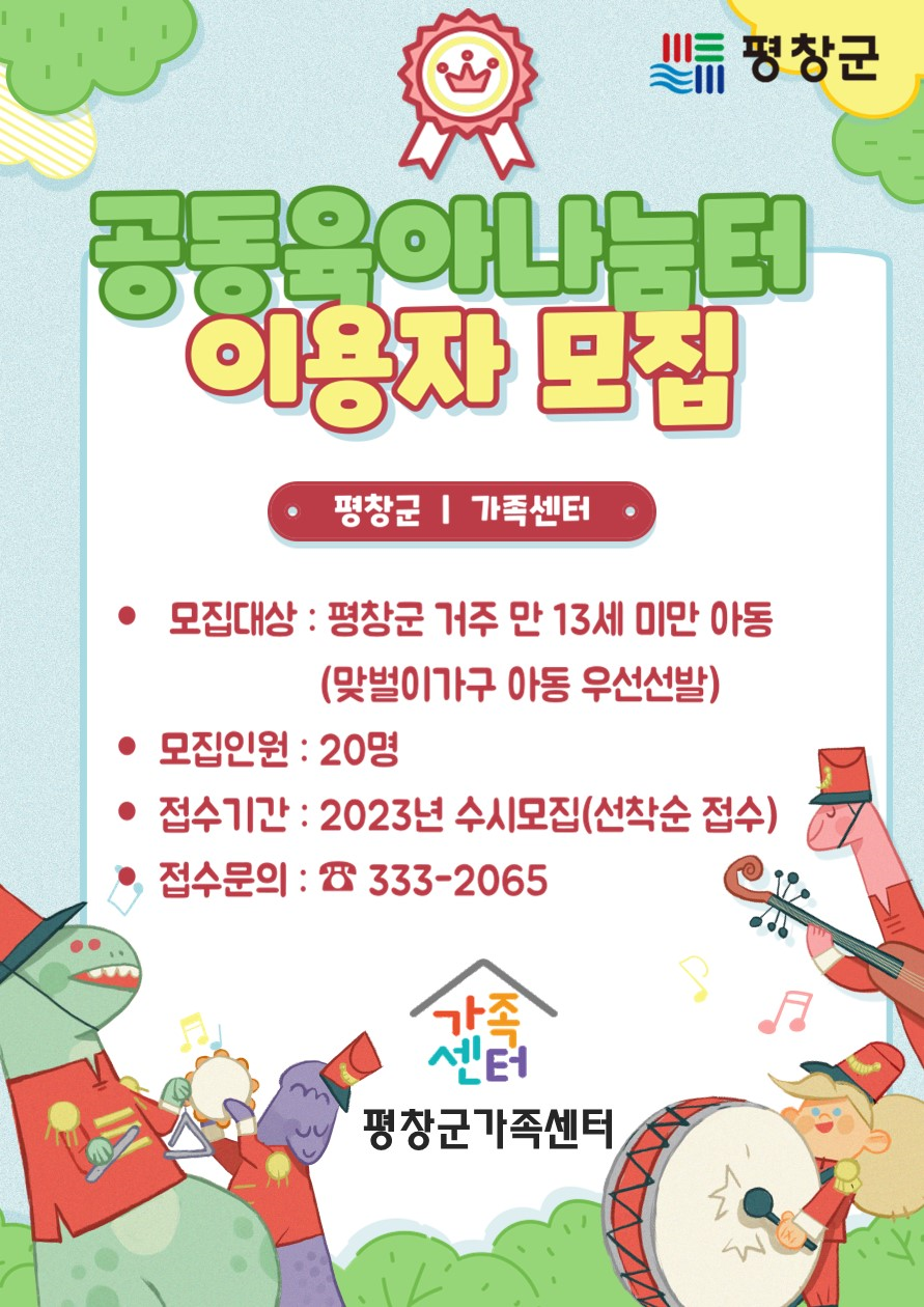 평창군이 올해도 돌봄공백을 메꾸기 위해 공동육아나눔터 이용자를 모집한다. 공동육아나눔터는 아동의 건강한 성장 발달을 지원하고 부모의 양육 부담을 경감시키는 등 가정육아 활성화를 위한 시설이다.