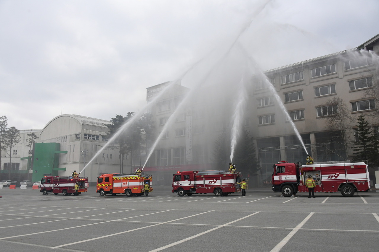 평창군은 봉평면 소재 휘닉스 평창 유스호스텔에서 다중 밀집시설 대형화재 발생과 이로 인한 건물붕괴로 다수의 인명피해 및 주요시설물의 피해 발생 상황을 가정한 현장훈련을 진행하였으며,