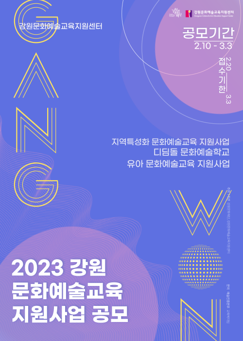 강원문화재단(대표이사 김필국)은 도내 문화예술교육 활성화와 시민들의 문화예술 향유 기회 확대를 위한 2023년 강원문화예술교육 지원사업 공모를 진행한다.