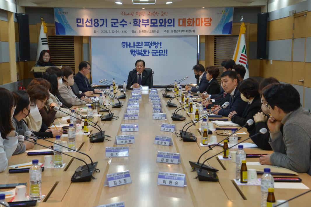 평창군 인재육성과(인재육성)는 군청 대회의실에서 심재국 평창군수와 지역 ··고 학부모연합회, 평창교육지원청 관계자 등 30 명이 참석한 가운데, ‘민선8기 군수와 학부모와의 대화마당을 개최하여 지역 교육의 발전을 위한 현안논의, 의견교환, 건의사항 청, 질의응답 등을 진행하였다.
