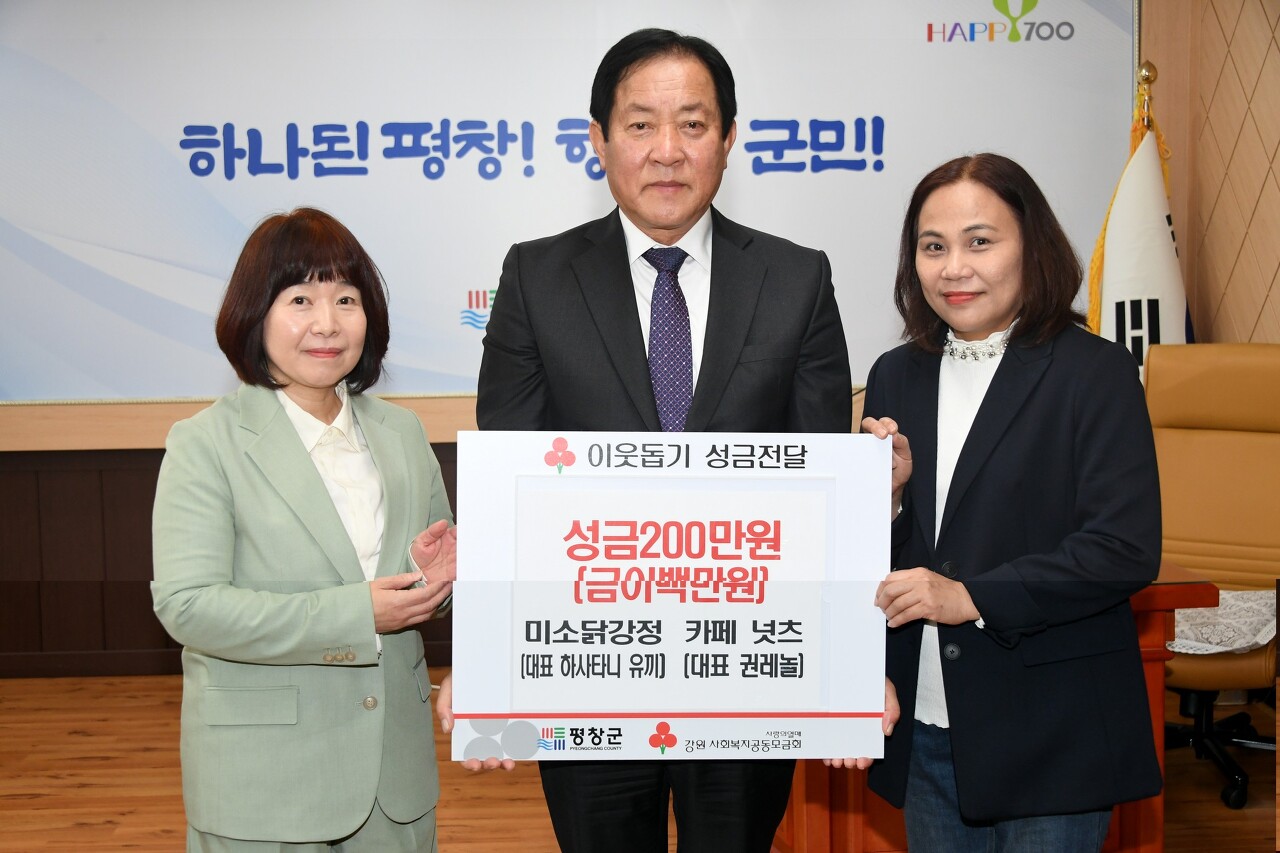 평창 미소닭강정(대표 하사타니 유끼)과 카페 넛츠(대표 권레놀)20일 평창군청을 방문하여 불우이웃 돕기 성금 200만원을 전달하였다.