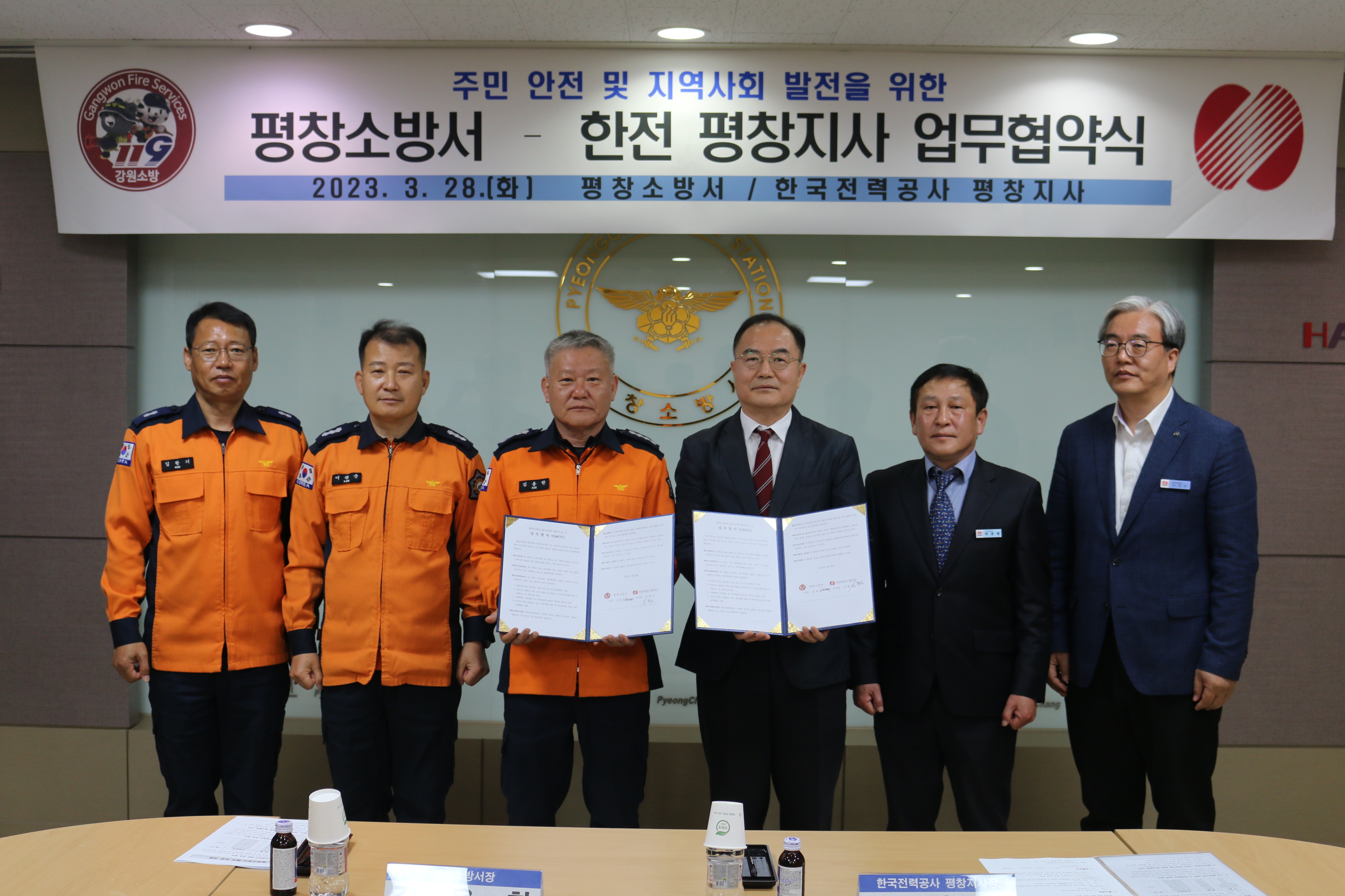 평창소방서(서장 김용한)와 한국전력 평창지사(지사장 손형도)는 28일 오전 10시 평창소방서 2층 소회의실에서 지역주민의 안전 증진 및 지역사회 발전을 위해 한국전력공사 평창지사와의 업무협약식을 개최했다고 밝혔다.
