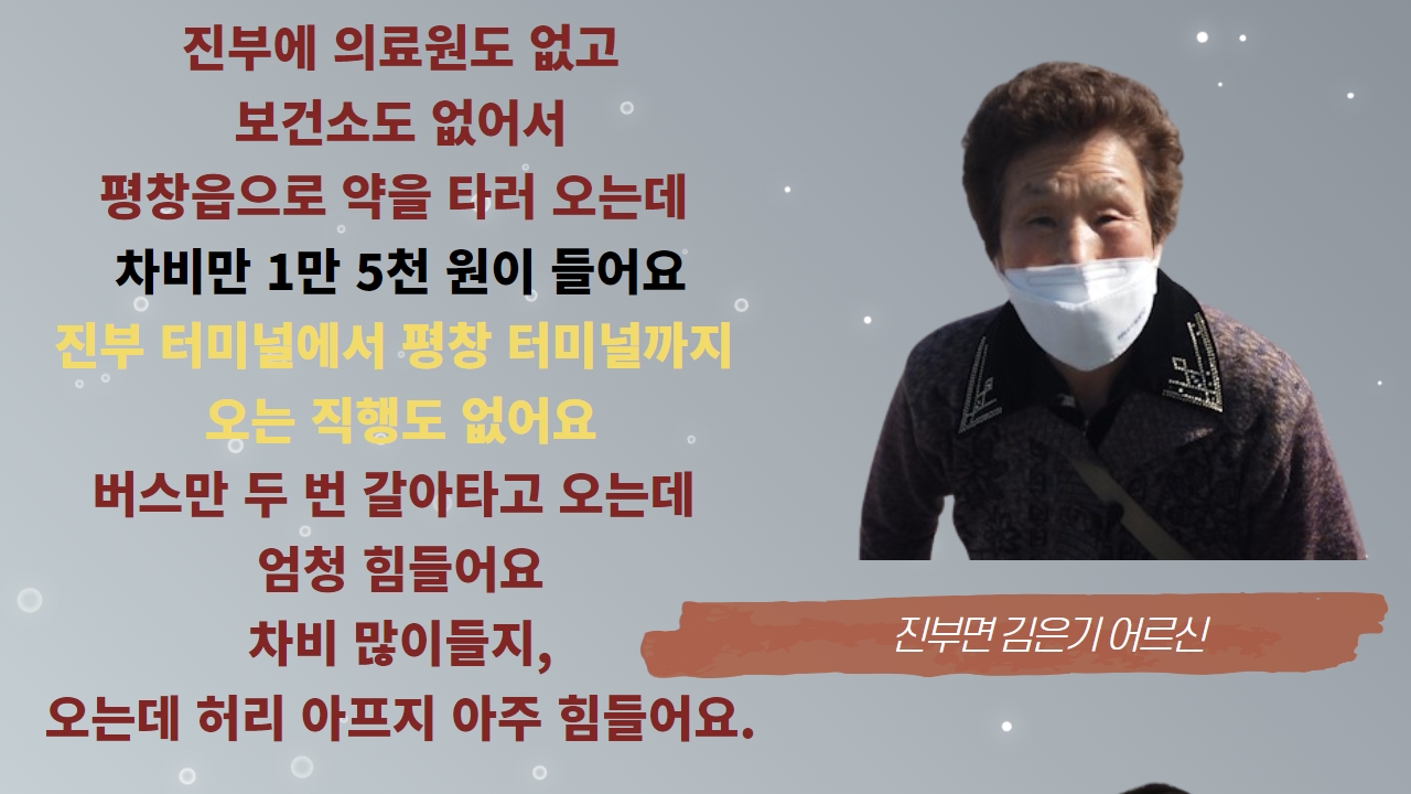 현장인터뷰 - 진부에 병원이 없어서 평창읍까지 1만5천원을 소비하며 병원을 다니시는 김은기 어르신께서는 버스비도 많이 오르고, 지역에 병원이 없어서 장거리 이동을 하시는 어려움을 말씀하셨습니다.