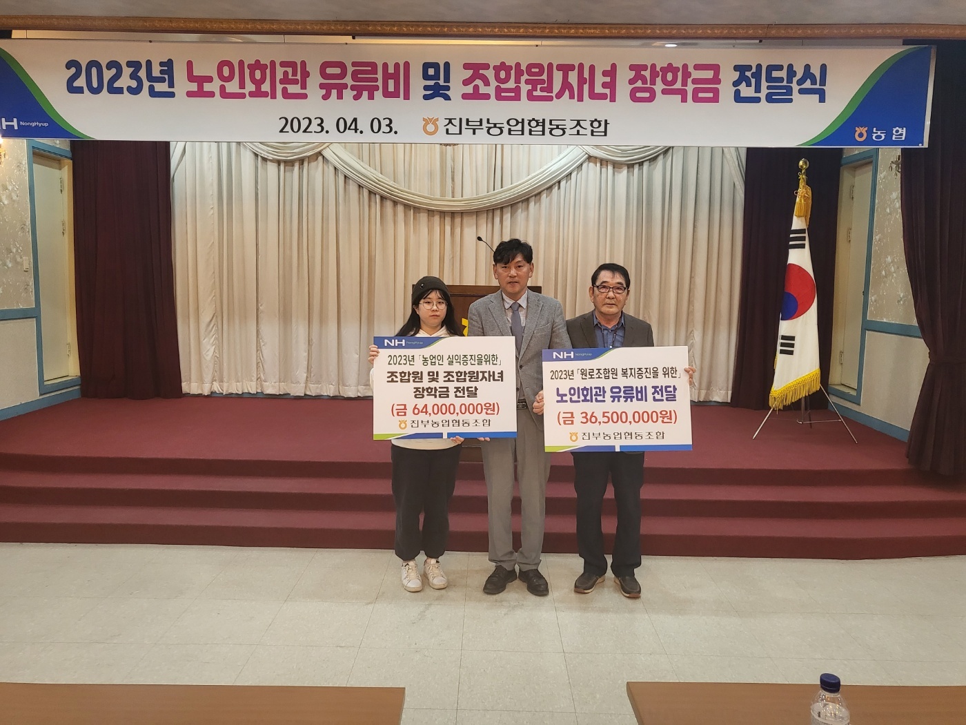 4월3일(월) 11시 진부농협 본점 3층 대회의실에서 진부면 관내 노인회관 유류비와 조합원 및 조합원자녀 장학금 전달식을 가졌다.