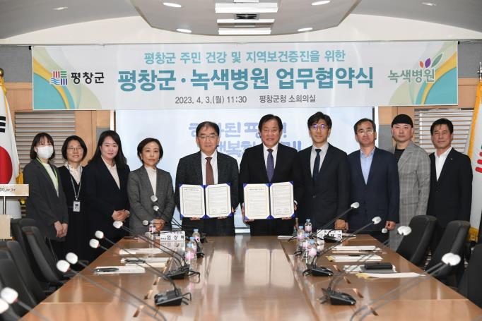 4.3일 군청 소회의실에서 심재국 평창군수와 임상혁 병원장 및 관계자 10여명이 참석한 가운데, 지역주민 건강 및 지역보건증진을 위한 녹색병원 의료 협약식이 진행되었다.