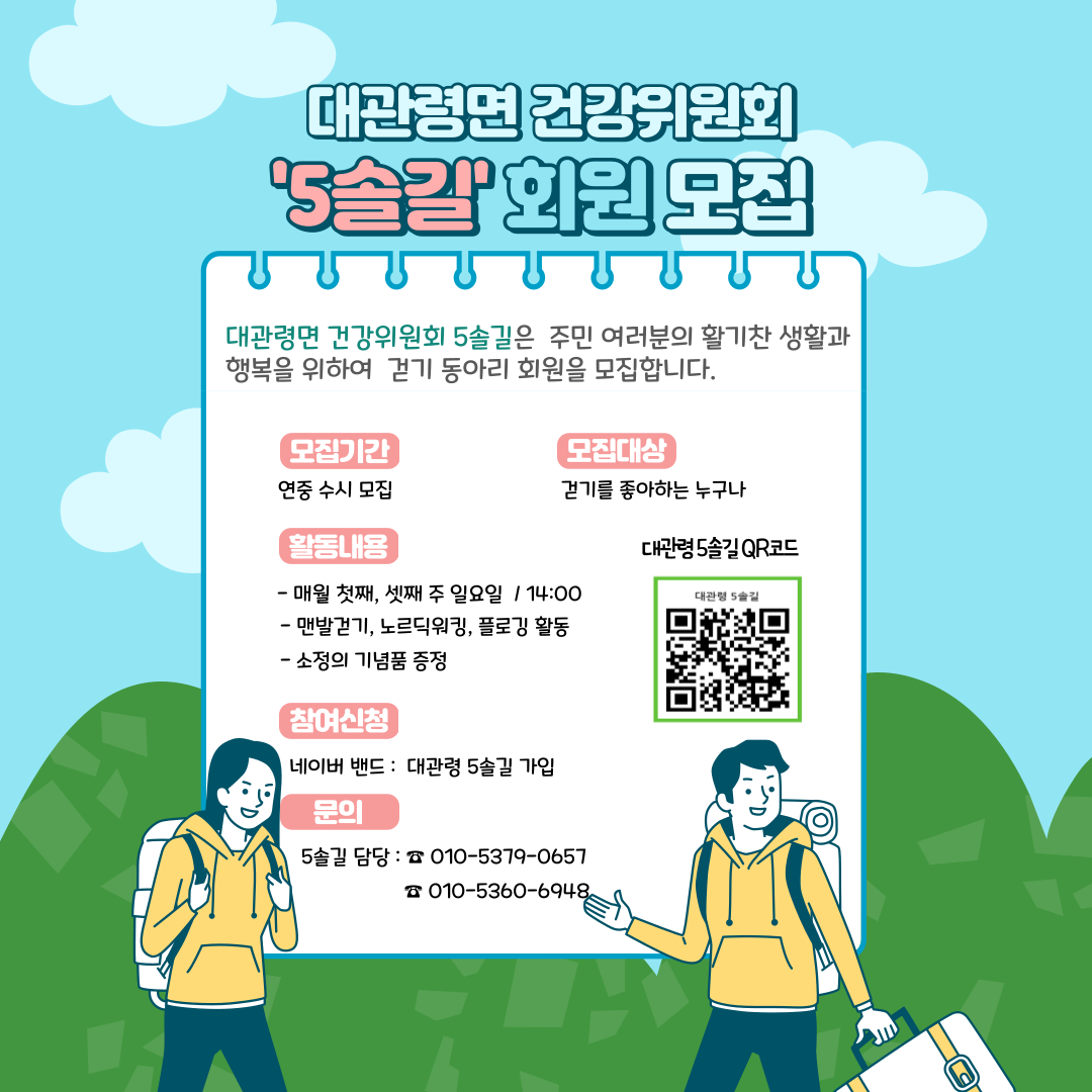 대관령면 건강위원회는 걷기 동아리 5솔길(5천명 면민이 걷는 솔바람 부는길) 회원을 중심으로 4월부터 12월 까지 매월 첫째, 셋째주 일요일 오후 지역주민 및 생활인구(워케이션)와 함께 대관령면 국민의 숲에서 걷기활동을 진행한다고 밝혔다.