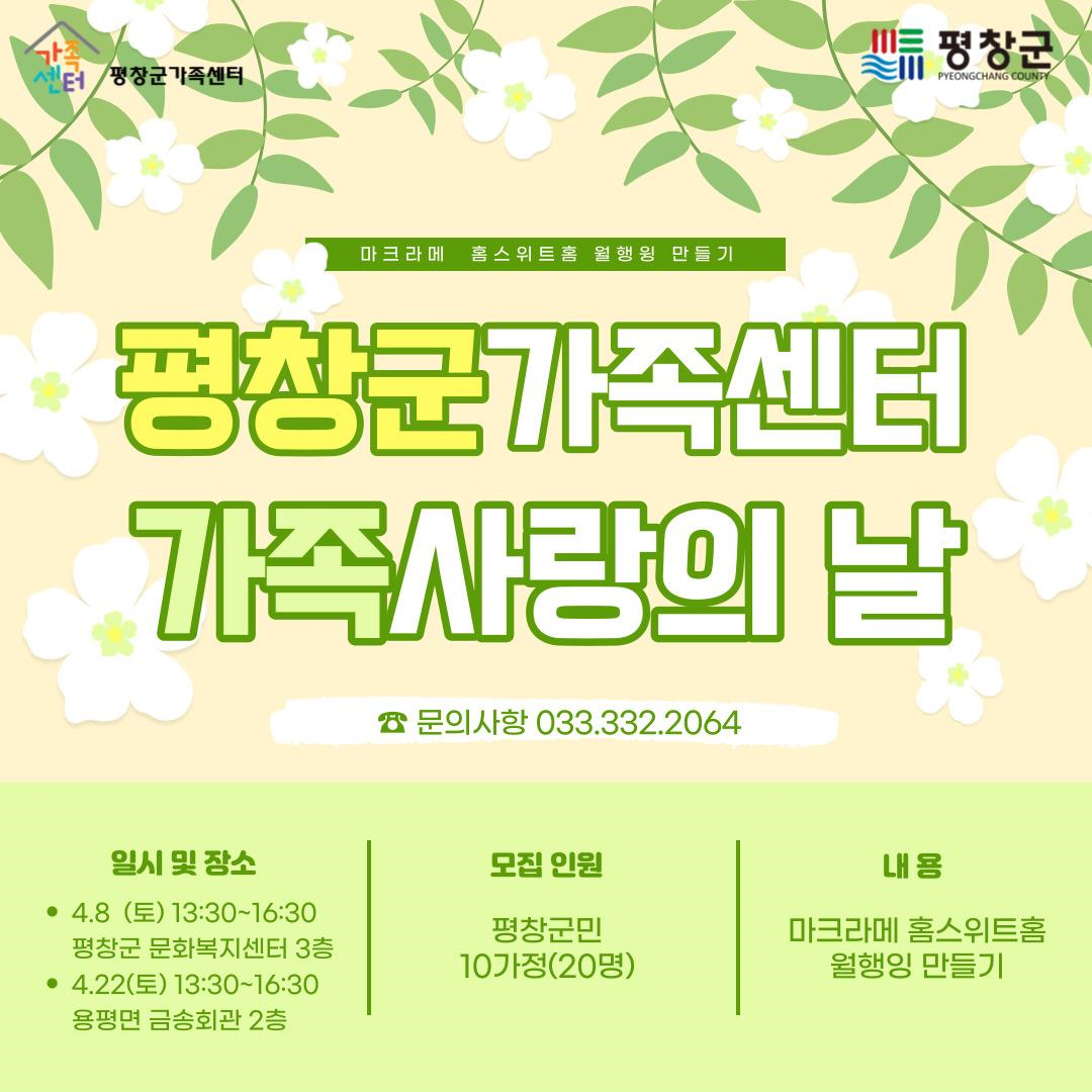 평창군가족센터는 4월 8일부터 가족프로그램의 일환으로 “가족사랑의 날”사업을 실시한다.