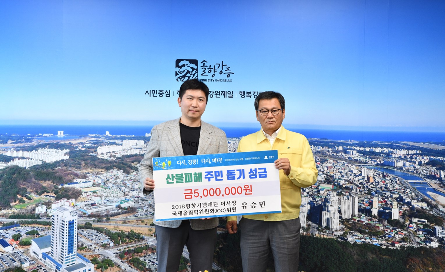 유승민 2018평창기념재단 이사장(IOC 선수위원, 대한탁구협회 회장)28일 김홍규 강릉시 시장, 김종욱 강릉시 부시장이 참석한 가운데 강릉시에 산불로 인한 지역사회 피해 복구를 위해 2018평창기념재단을 대표하여 사비로 성금 500만원을 전달했다.