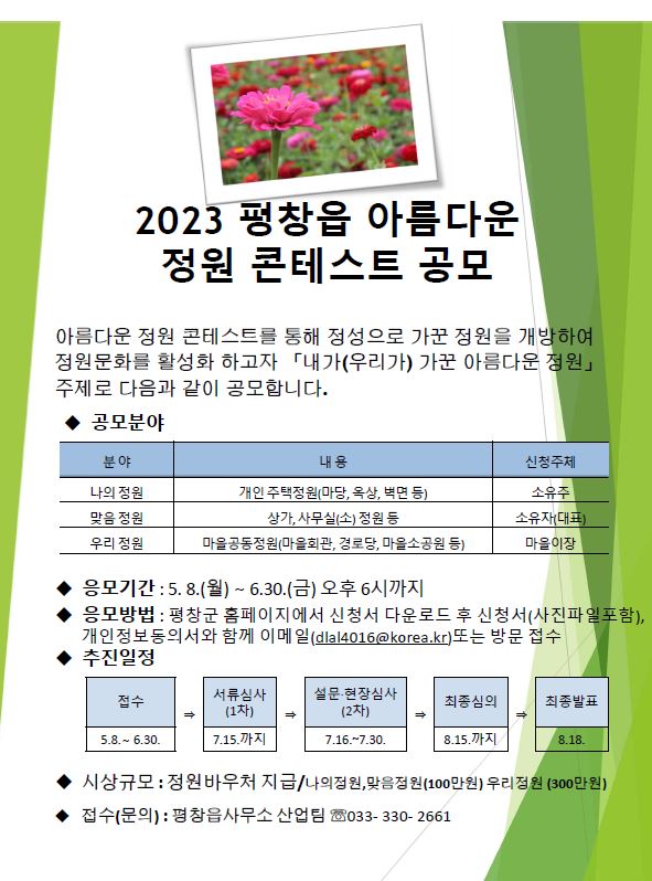 평창읍은 6월 30일까지 평창읍민을 대상으로 「2023년 평창읍 아름다운 정원 콘테스트」공모 참가 신청을 받는다.