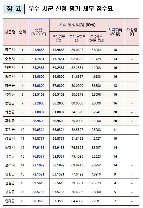 - 강원도 역대 최고 실적 92.7% 달성, 시군 종합평가 9개 우수 시군 선정
