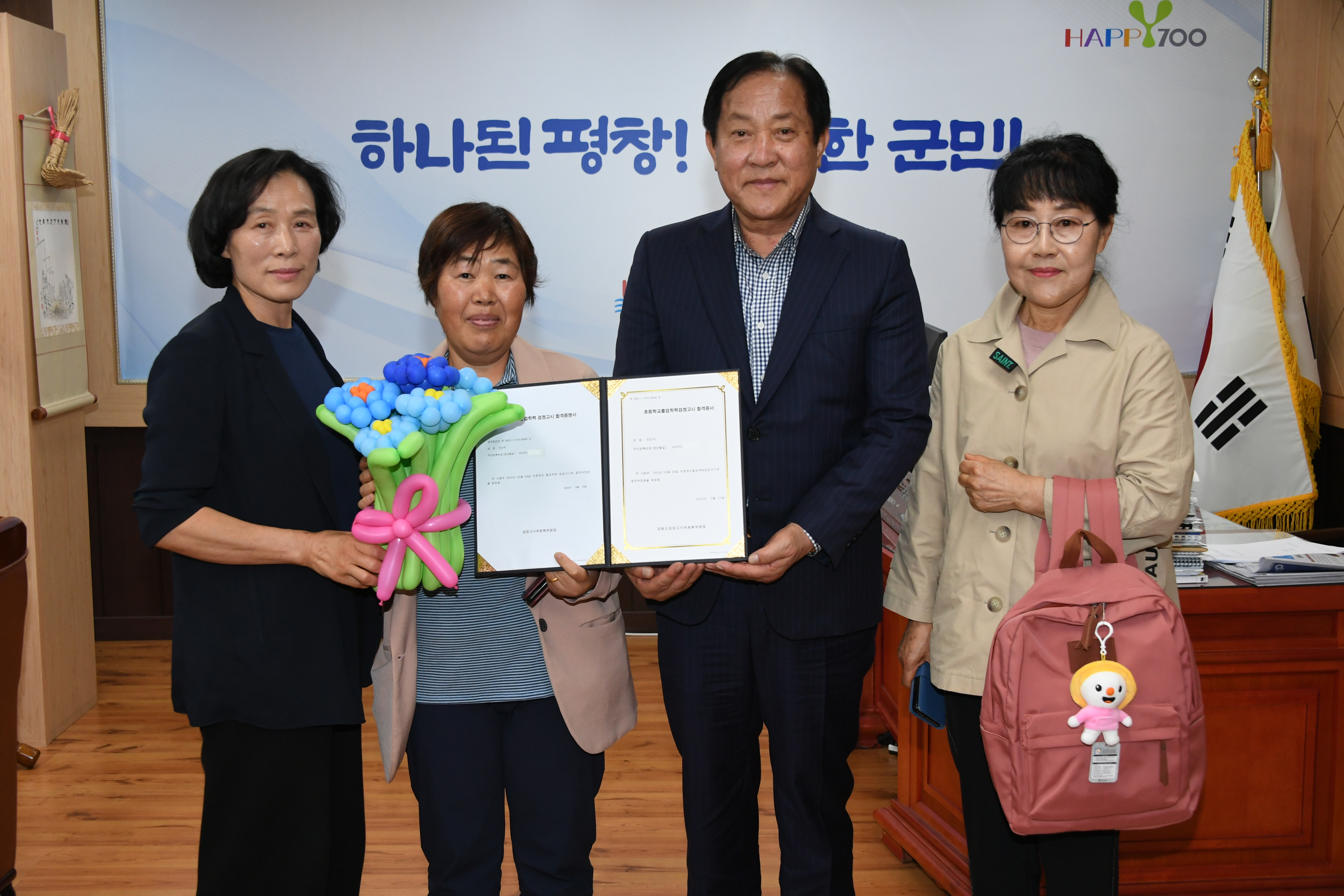 심재국 평창군수는 두 어르신의 합격을 축하하며 직접 합격증서를 전달하고 학업을 계속할 수 있도록 격려하였다. 또한 어려운 상황에서도 배움에 대한 열정을 갖고 노력하신 두 어르신들을 진심으로 축하하며, 우리군에서는 배우고자 하는 군민들을 위해서 다양한 맞춤형 프로그램을 운영할 수 있도록 적극 지원하겠다.”라고 전했다.