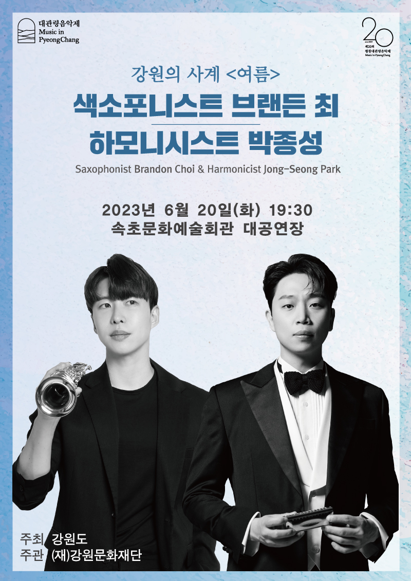 다채로운 공연을 지속적으로 선보이며 강원도민과 음악 애호가들의 큰 사랑을 받고 있는 대관령음악제의 기획시리즈 [강원의 사계]가 다가오는 여름을 맞아 강원의 사계 <여름>에서 ‘색소포니스트 브랜든 최 & 하모니시스트 박종성’의 이색적인 클래식 악기들의 특별한 프로그램을 선보인다.