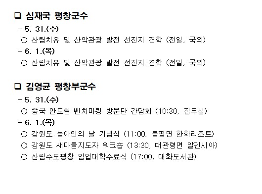 ੦ 오늘(5.31.) 10:30, 국제교류도시 중국 안도현에서 직원 24명이 평창군을 방문하여 우수 농업시설과 주요 관광지를 견학하는 시간을 가질 예정임.