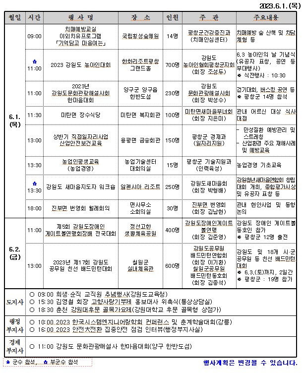 오늘(6.1.) 11:00, 강원도농아인협회 평창군지회(회장 조성두)에서는 평창 한화리조트 그랜드홀에서 6월 3일 농아인의 날을 기념하여 내빈 및 참석자 약 700명이 참석한 가운데‘2023 강원도 농아인 대회’를 개최할 예정이다.