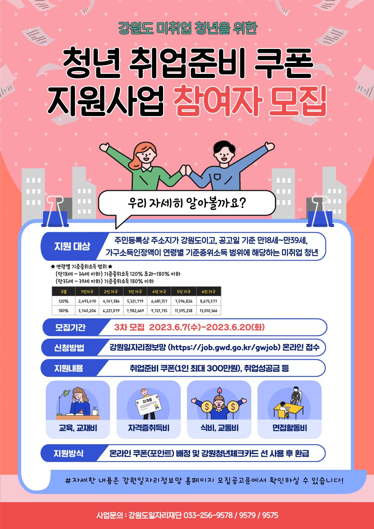 강원도와 강원도일자리재단은 도내 만18세~만39세 미취업 청년들의 안정적인 구직활동 지원을 위해 6월 7일부터 2주간「청년 취업준비 쿠폰 지원사업(구,강원도 청년구직활동 지원사업)」의 3차 참여자를 모집한다.