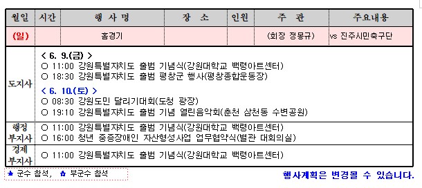 오늘(6.9.) 17:50, 평창군 기획실은 평창종합운동장에서 초청인사, 평창군민 등 3,000여 명이 참석한 가운데, 2024 강원 동계청소년올림픽 성공개최와 강원특별자치도의 성공 출범을 기념하는 기념식 및 특집 콘서트를 개최할 예정이다.