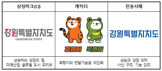 원도는 202210월부터 강원디자인진흥원과 공동으로 강원특별자치도 상징물 개발에 착수해, 전국민 대상 선호도 조사, 전문가 평가 및 강원도의회 의결 등을 거쳐 신규 상징마크(CI), 캐릭터(강원이특별이), 전용서체(강원특별자치도체) 개발을 완료확정하고, 오늘 강원특별자치도 출범 기념식에서 공개발표했다.