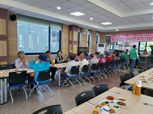 지난(6.9.) 11:30, 방림면새마을지도자남녀협의회(회장 경민수·이영희)는 계촌복지회관에서 장수식당을 운영하여 관내 어르신 122명에게 점심식사를 대접했다.